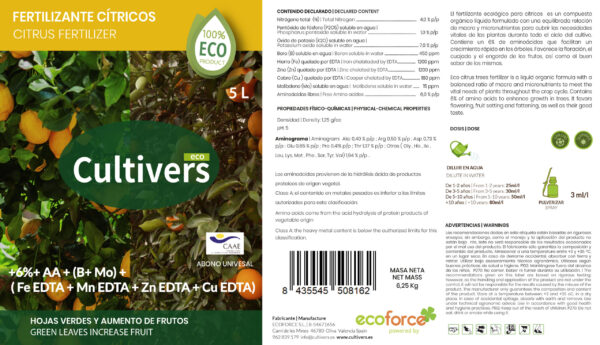 Nuestro Abono Cítricos Líquido Ecológico es un fertilizante ecológico para cítricos en formato líquido. Formulado con una equilibrada relación de macro y micronutrientes para cubrir las necesidades vitales de las plantas durante todo el ciclo del cultivo. Contiene un 6% deaminoácidosque facilitan un crecimiento rápido en los árboles. Favorece la floración, el cuajado y el engorde de los frutos, así como el buen sabor de los mismos.