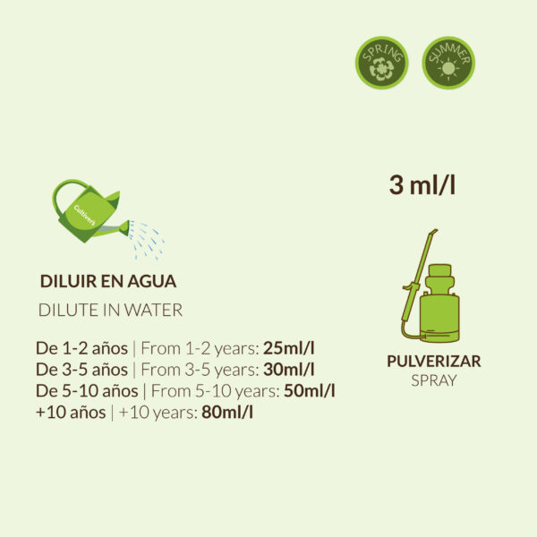 - Riego: Diluir en agua:De 1-2 años: 25ml/l; De 3-5 años: 30ml/l; De 5-10 años: 50ml/l; +10 años: 80ml/l