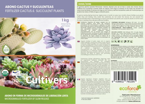 Abono Cactus Ecológico. Cultivers especialistas en fertilizantes ecológicos, ofrece un abono orgánico fabricado con formulación especial para todo tipo cactus, crasas y suculentas en general utilizando un tipo específico de micorrizas para que promueva el sistema radicular y el crecimiento sano.