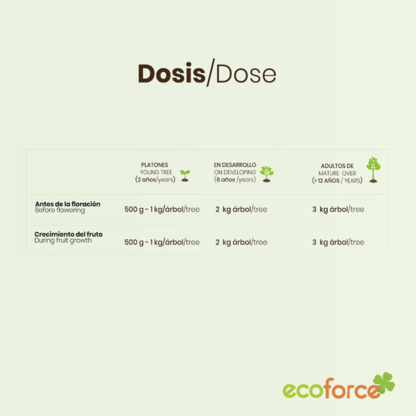 - Pre-Floración: 1 kg-2 kg/árbol.