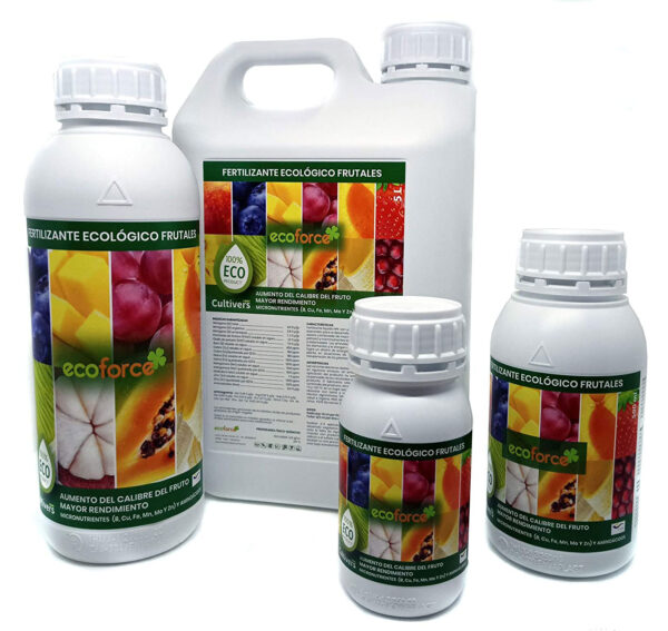 Abono Frutales Líquido Ecológico para frutales. Es un compuesto orgánico líquido formulado con una equilibrada relación de macro y micronutrientes para cubrir las necesidades vitales de las plantas durante todo el ciclo del cultivo. Contiene un 6% de aminoácidos que facilitan un crecimiento rápido en los árboles. La floración gracias a este abono se ve favorecida, el cuajado y el engorde de los frutos, así como el buen sabor de los mismos.