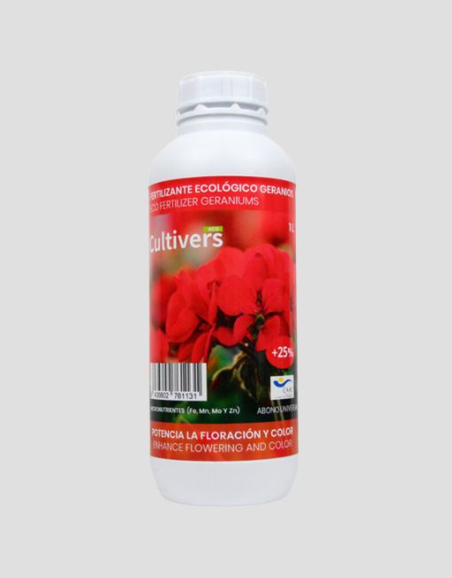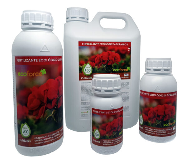 Abono Geranios Líquido Ecológico. Nuestro fertilizante ecológico para geranios es un formulado orgánico con un estudiado equilibrio nutricional que proporciona un desarrollo óptimo en los geranio. Una floración exuberante y duradera contiene un complejo de macro y micronutrientes que optimizan todas sus fases de crecimiento y floración de las plantas.