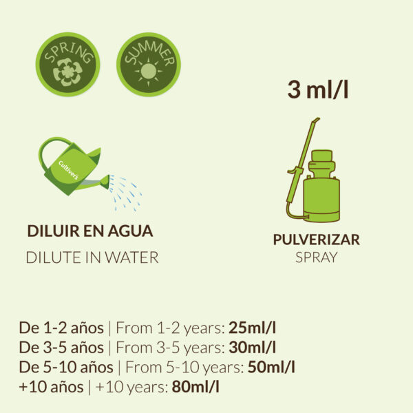 • Riego: Diluir en agua: De 1-2 años 25 ml/l; De 3-5 años; 30ml/l De 5-10 años 50ml/l; +10 años: 80ml/l