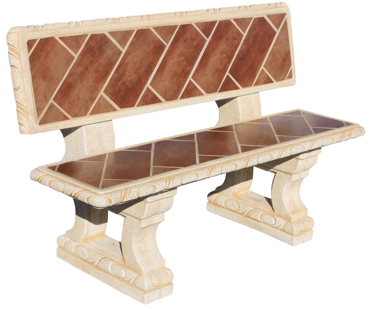 BANCO PARA JARDÍN DE PIEDRA ARTIFICIAL CON RESPALDO Y AZULEJOS MODELO POPULAR MADERA OCRE