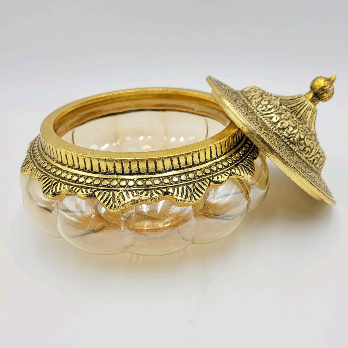 Una caja decorativa con la que decorar tus ambientes de manera original. Fabricada en cristal y tapa de aluminio en color dorado. Una caja decorativa ideal para ambientes boho, étnicos o de aire árabe. Tiene un tamaño de 16 cm