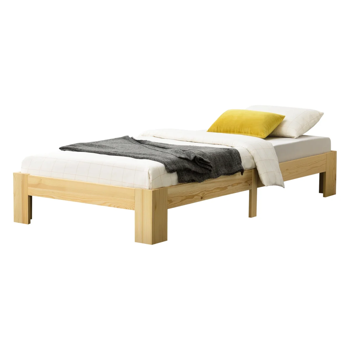 La cama robusta de madera de pino embellece cualquier dormitorio con su apariencia y ofrece un lugar de descanso agradable.