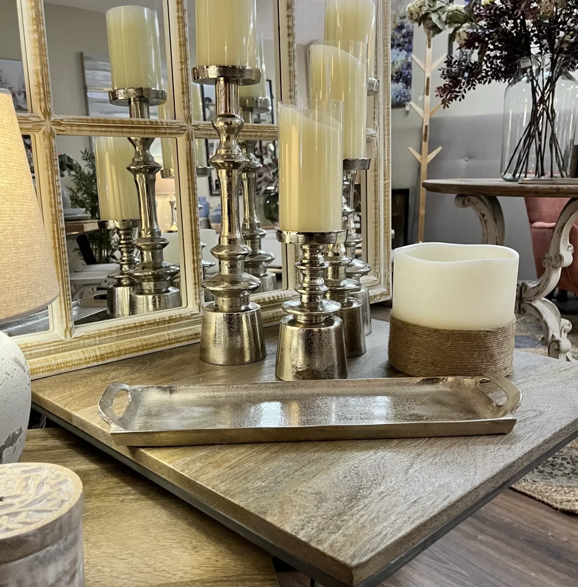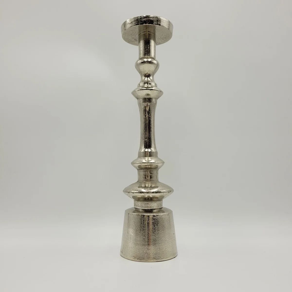 Decora tus espacios con este portavelas plateado de metal con base ancha y detalles intermedios. Fabricado en níquel con un diseño clásico y versátil para combinar en todo tipo de ambientes. Un candelabro plateado de 9×37 cm ideal para colocar en la mesa, en el recibidor sobre un mueble.