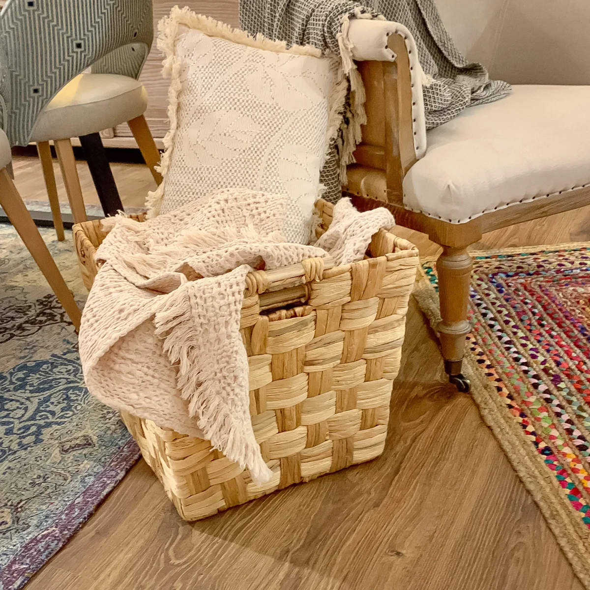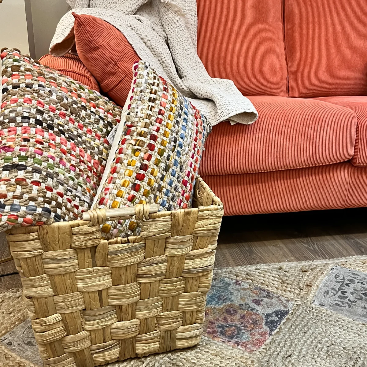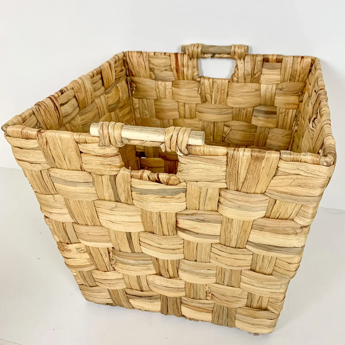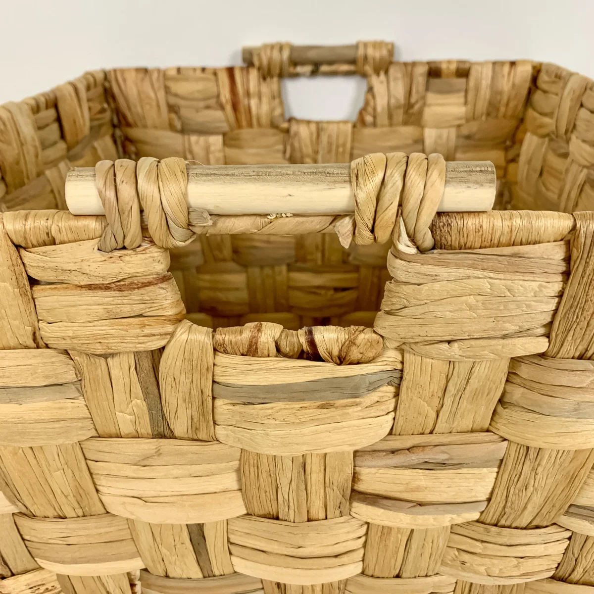 Una cesta cuadrada de fibras naturales tejida en trenzado con asas laterales. Una cesta decorativa de 40x40x35 disponible en 3 tamaños, ideal para hacer composiciones o por separado. Colócala junto al sofá y ten a mano siempre una mantita, cojines o lo que prefieras.