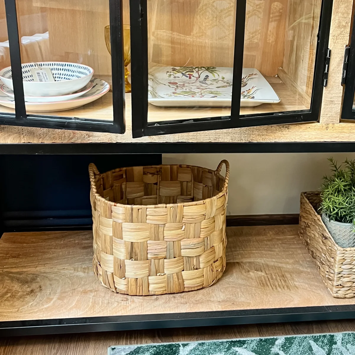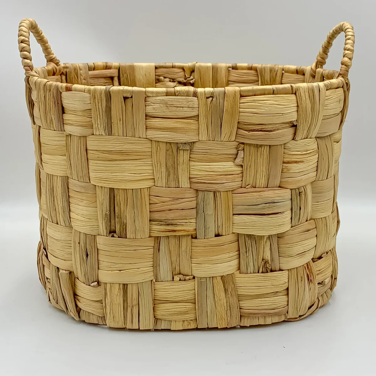 Una cesta redonda de fibras naturales tejida en trenzado con asas laterales. Una cesta decorativa redonda de 30x25x35 disponible en 3 tamaños, ideal para hacer composiciones o por separado. Colócala junto al sofá y ten a mano siempre una mantita, cojines o lo que prefieras.