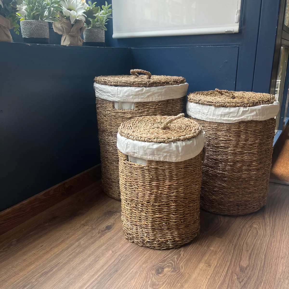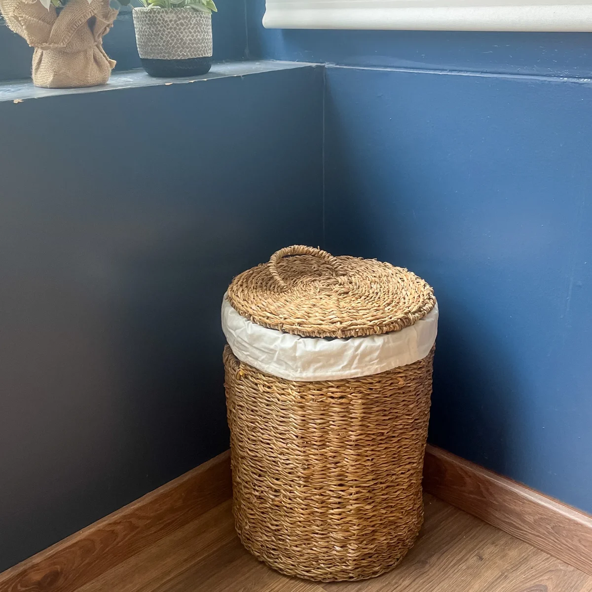 Un cesto para organizar la ropa fabricado en seagrass, un material natural de hierbas marinas entretejidas, muy resistentes, antiestáticas y con un revestimiento muy suave. Por su naturaleza, son resistentes al agua y a las manchas, pero es un tipo que no tolera los tintes. Tiene un tejido interior de algodón color crema.