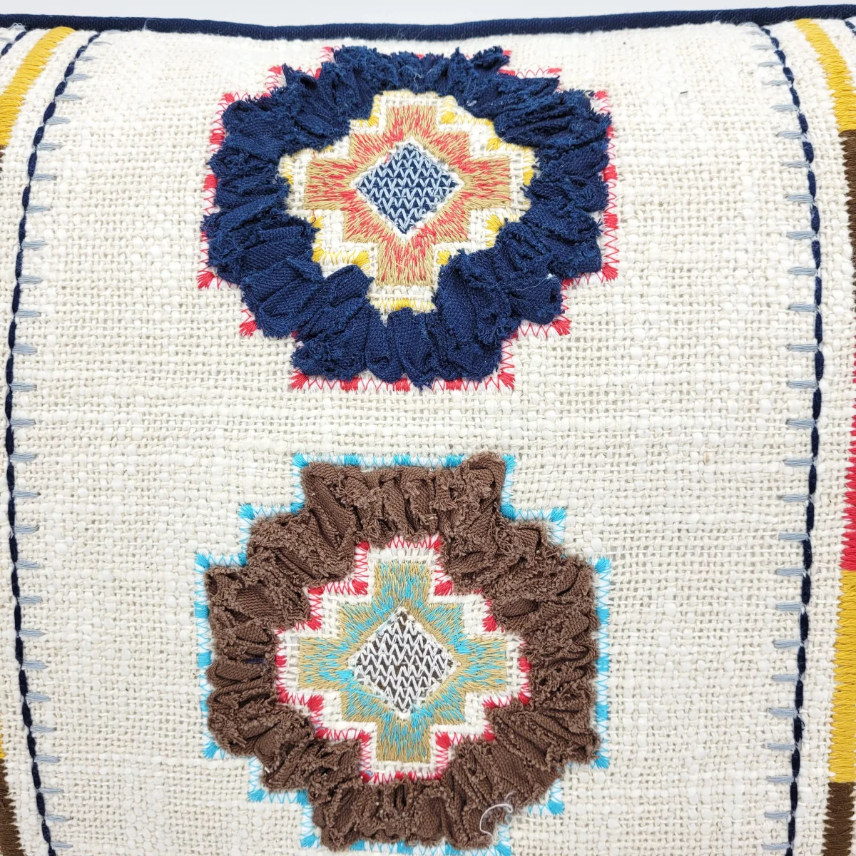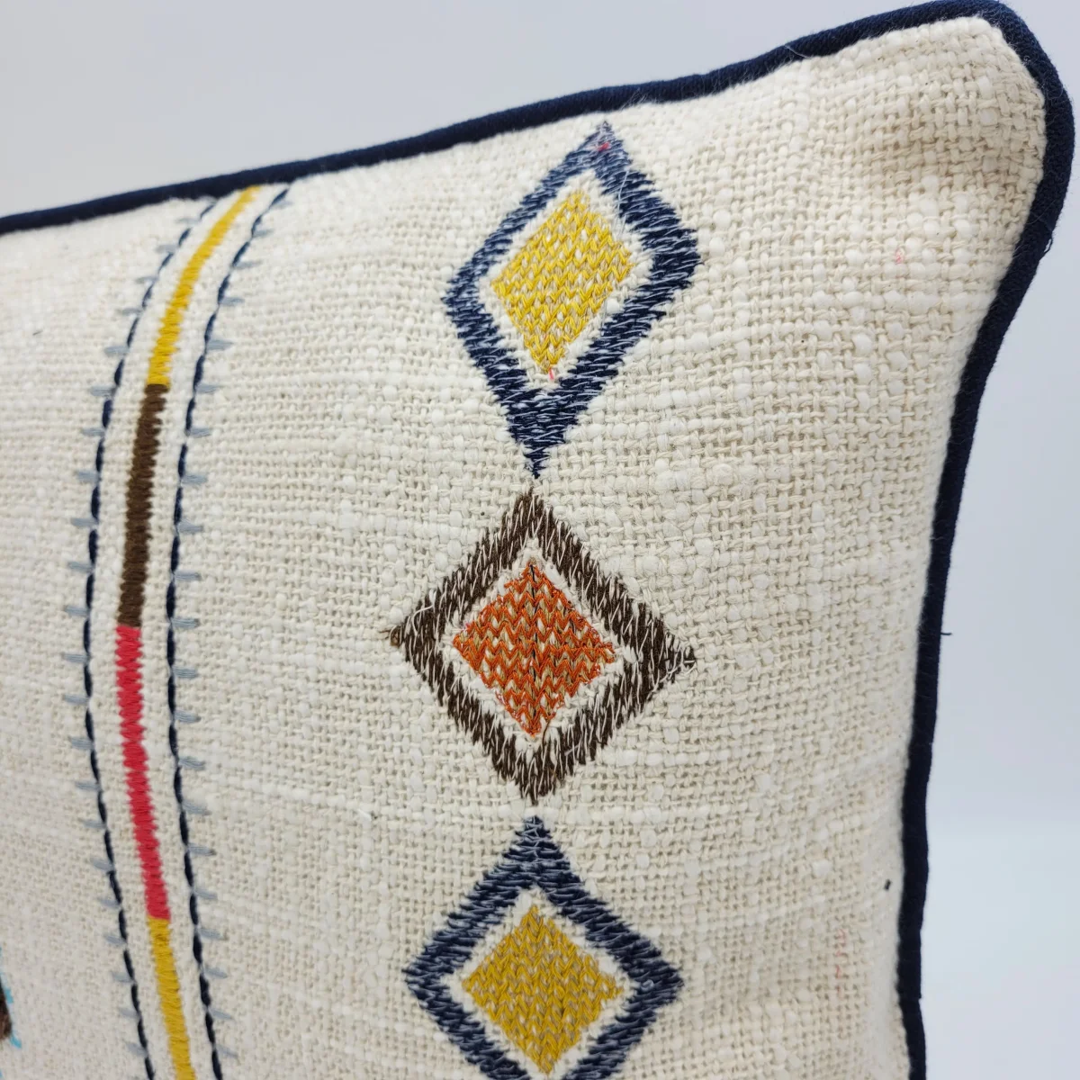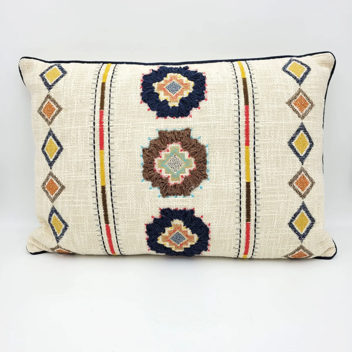 Añade un toque de color a tu salón o dormitorio con este cojín de estilo étnico 100% algodón. Diseño geométrico con bordado multicolor. Ideal para combinar con tonos neutros y aportar un toque de personalidad. Combínalo con el tamaño de 50x15x50 y crea ambientes únicos.