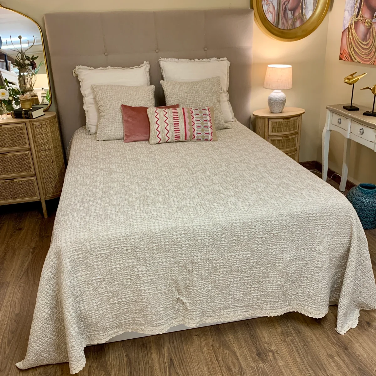 Este cojín de algodón está confeccionado en nido de abeja, técnica decorativa que le da un toque muy elegante. Un cojín beige de 50×50 con un diseño versátil, que combinará a la perfección con el resto de textiles. Incluye relleno y tiene un cierre lateral con cremallera. Completa tu ambiente con la medida de 50×30 para crear ambientes únicos. Además tiene la colcha a juego par un dormitorio con estilo.