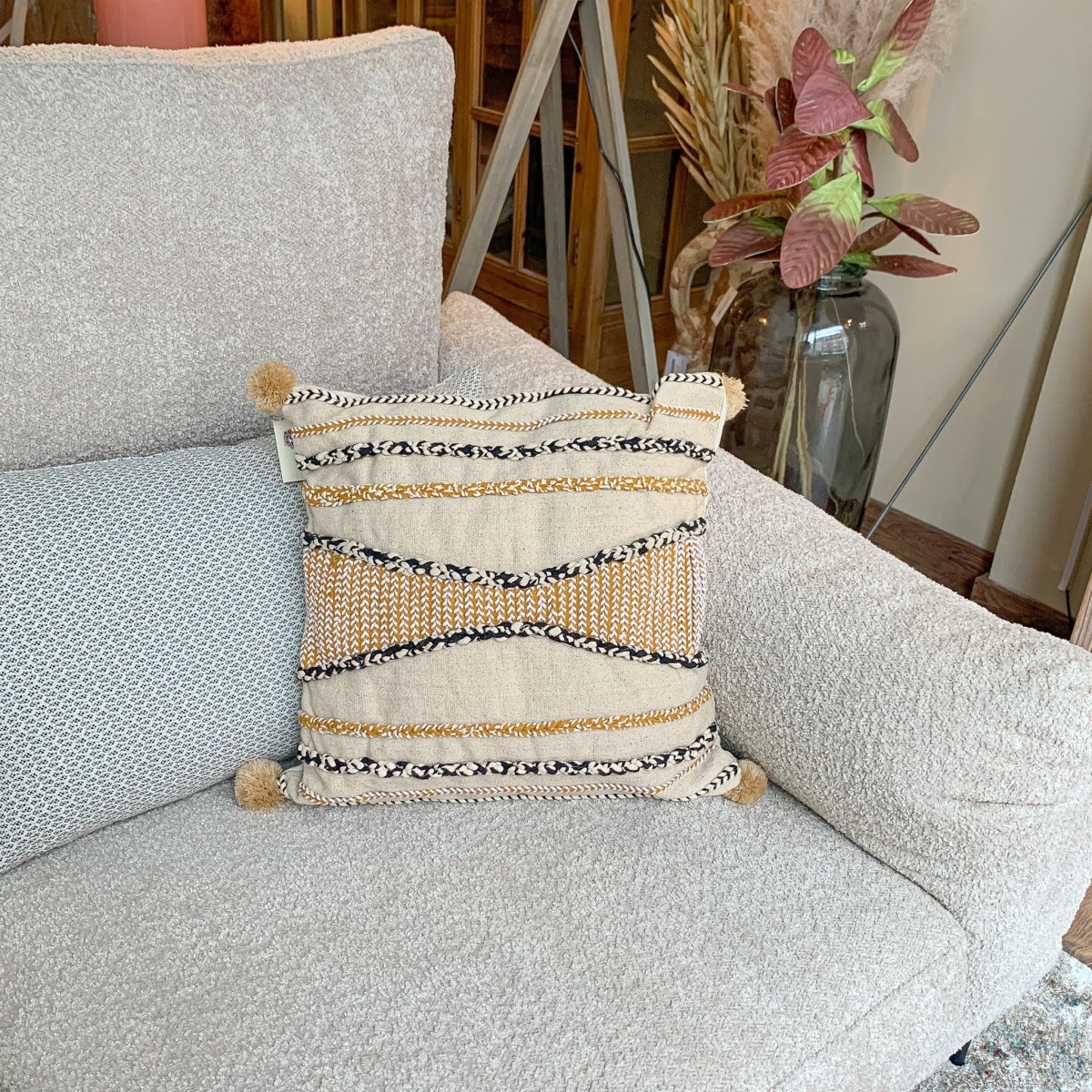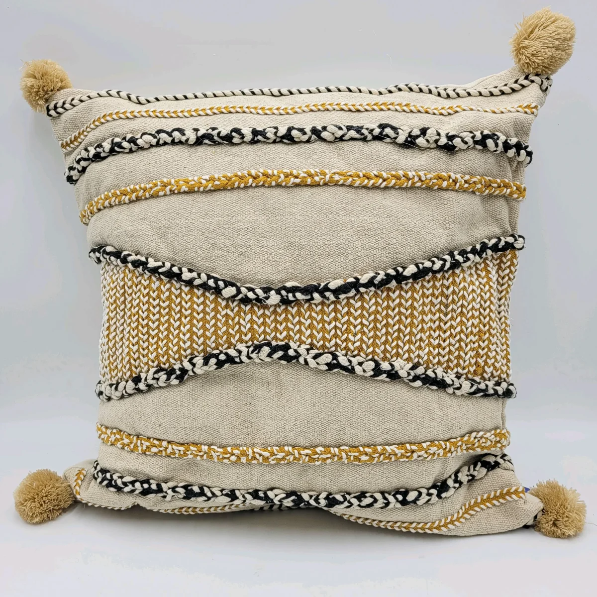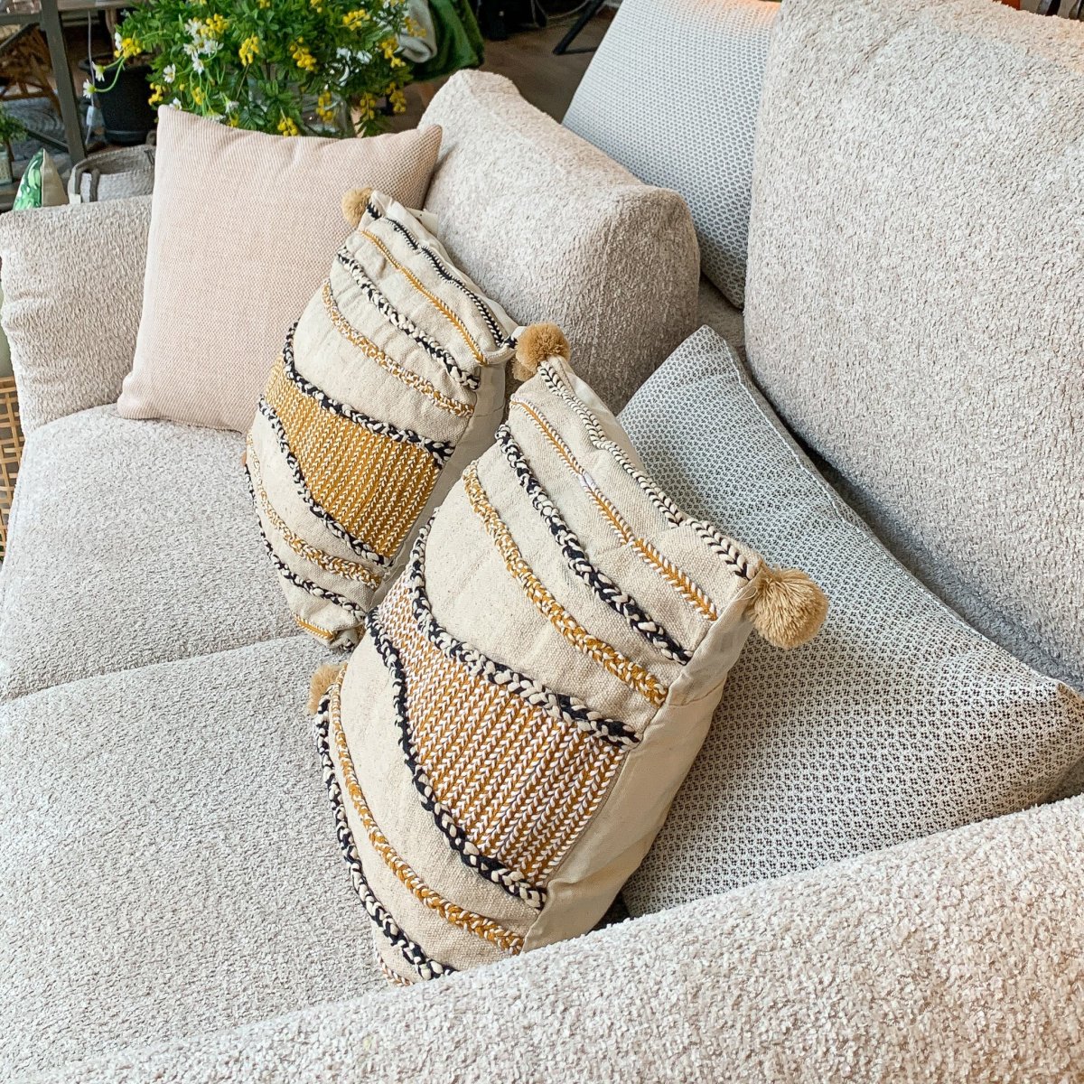 Un cojín de lana y algodón beige, amarillo y negro con un diseño geométrico rayado y acabado en pompones. Un cojín versátil en colores cálidos para llenar tu hogar de calidez y estilo. Un cojín de 45×45 perfecto para salones y dormitorios, ideal para estilos boho, étnico y nórdico.