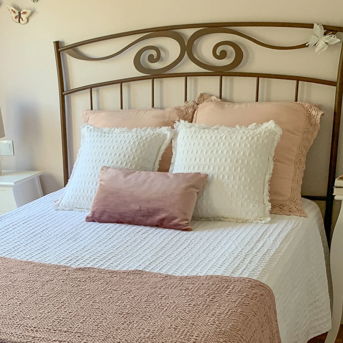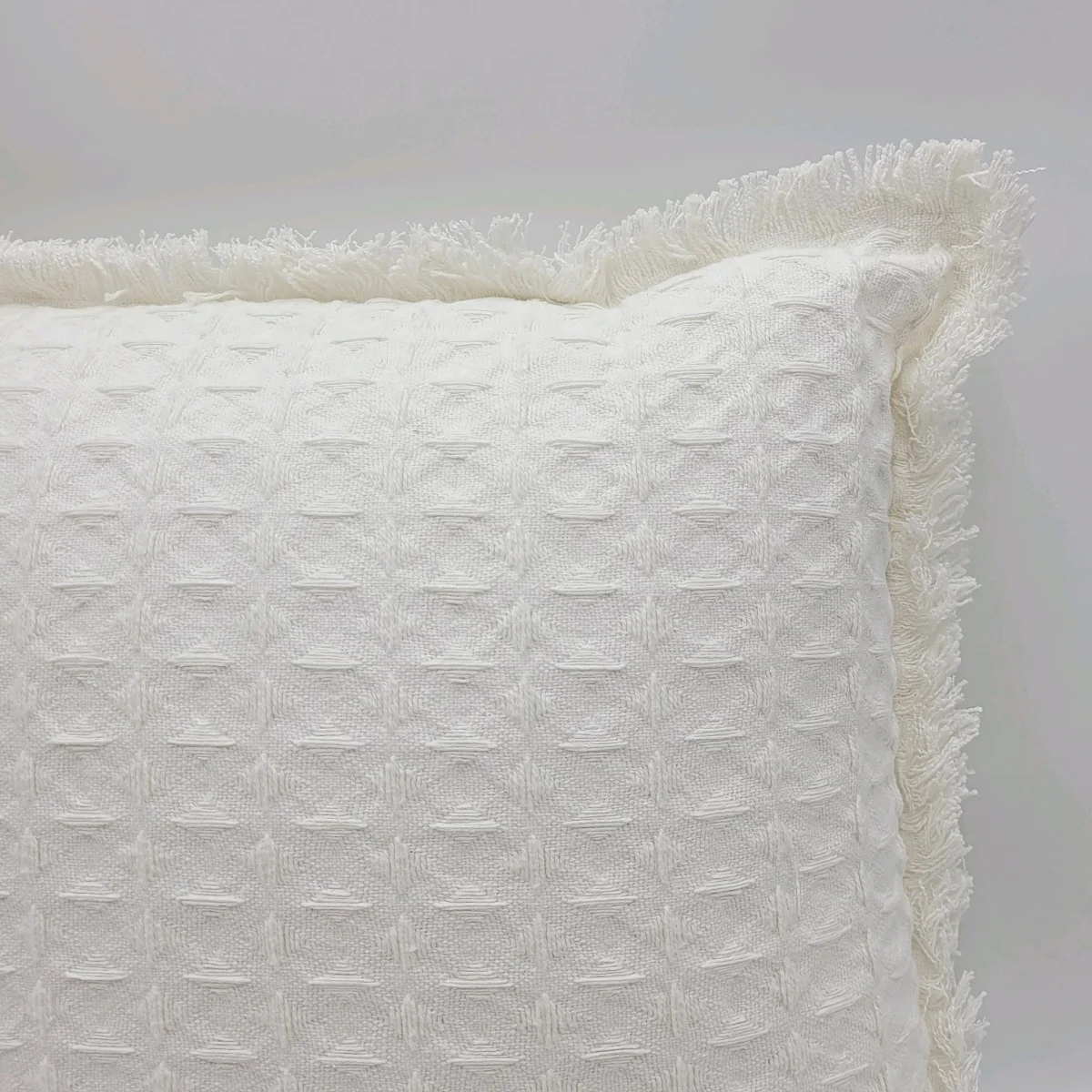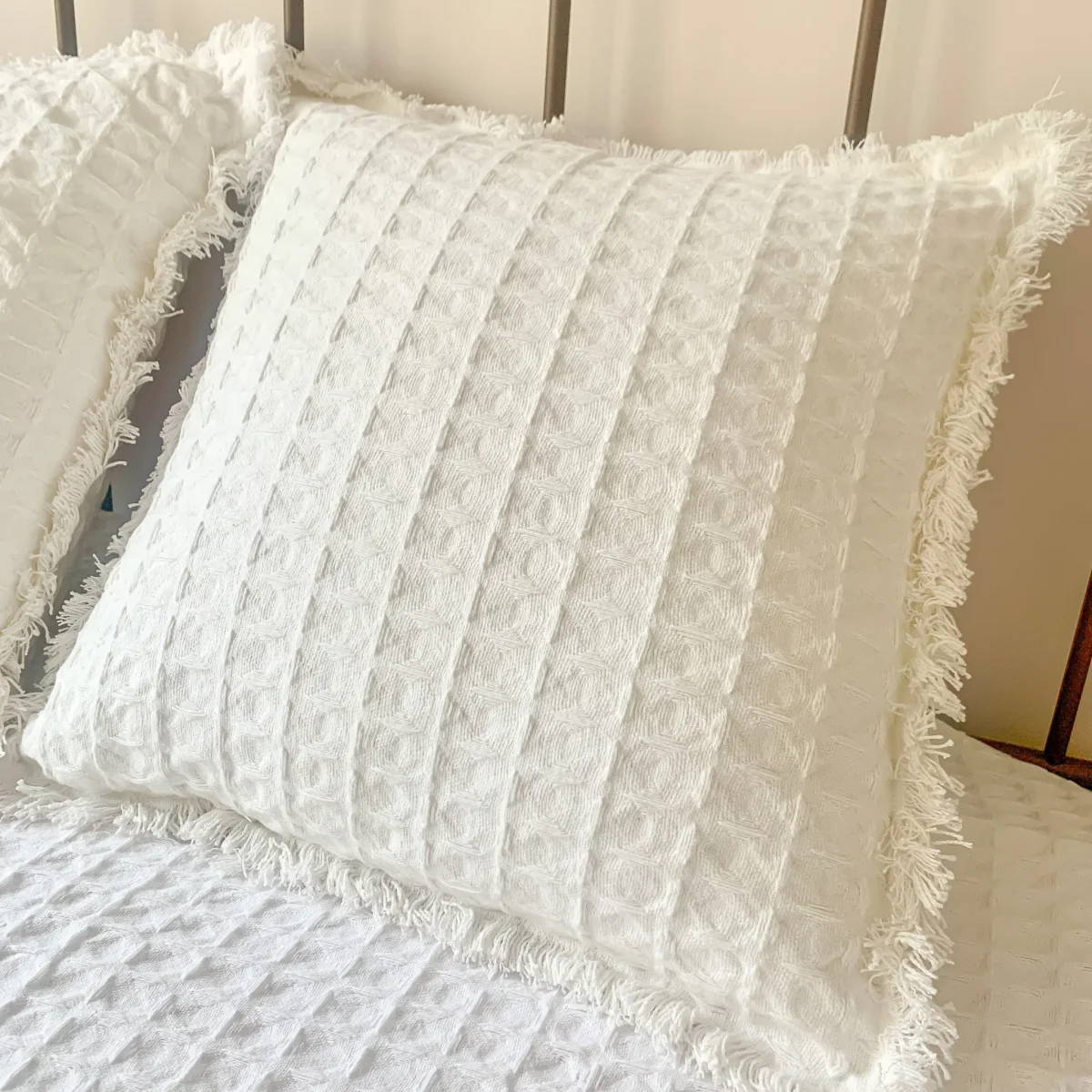 Un cojín de algodón 100% tejido en nido de abeja, una técnica decorativa llena de elegancia. Un cojín de 45×45 con relleno incluido a juego con nuestra colcha panal blanco 240×260, combínalos para tener una cama de revista. Un cojín blanco de acabado en flecos, lo que le da un toque muy original. Colócalo en el dormitorio, en el sofá o en una butaca de lectura, su versatilidad te permitirá adaptarlo a todos tus ambientes.