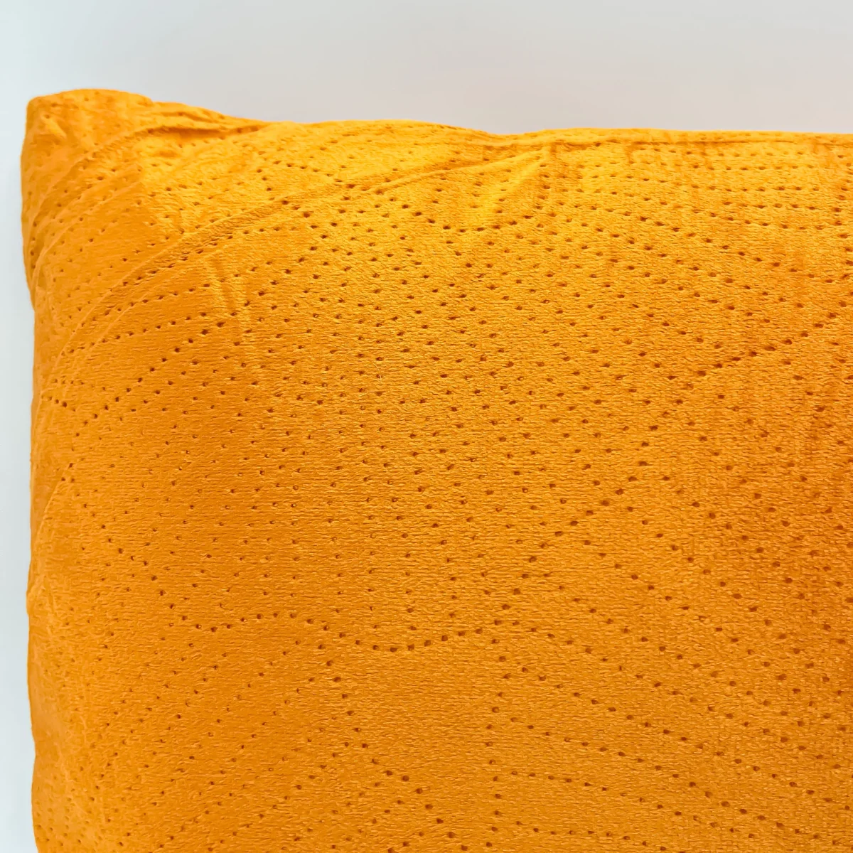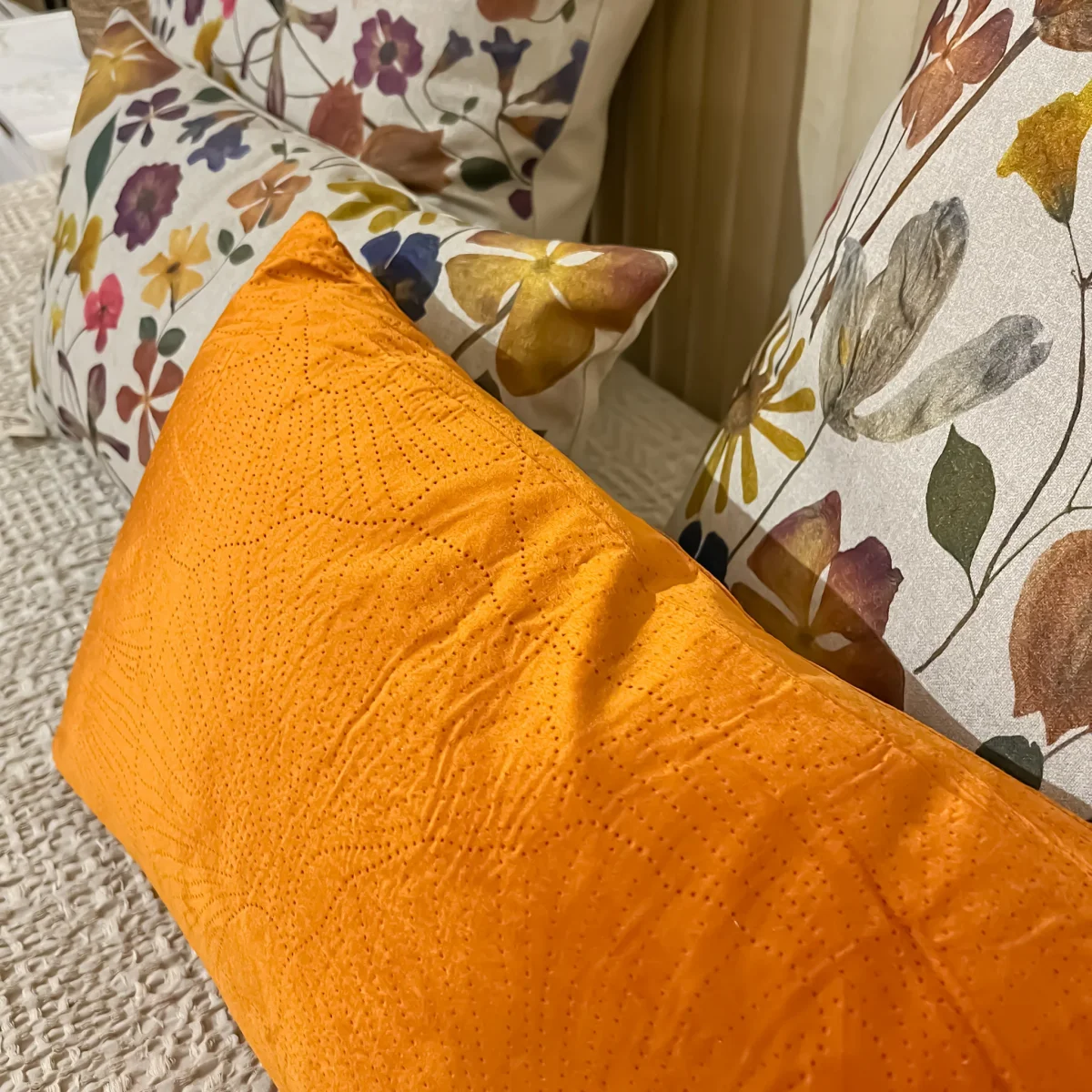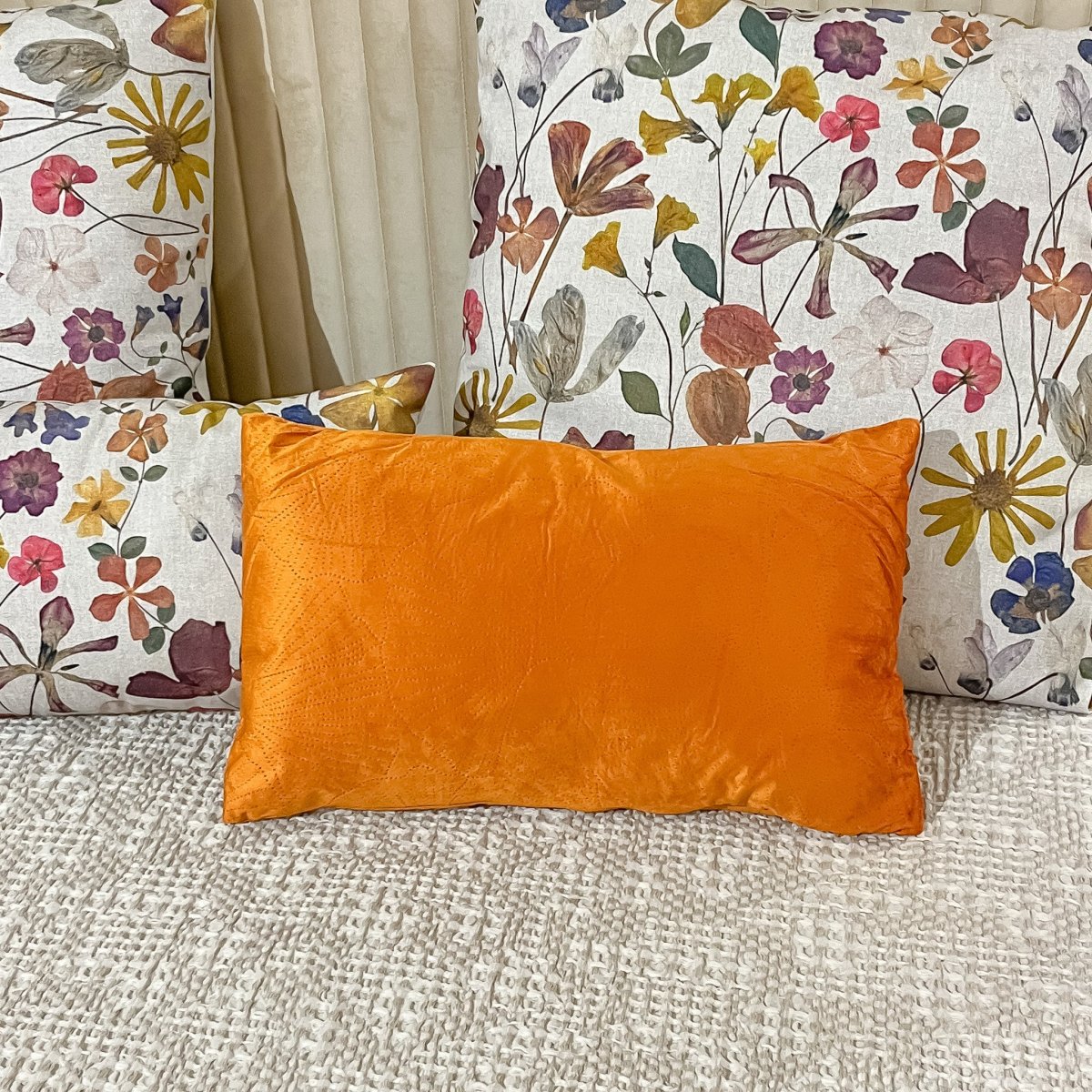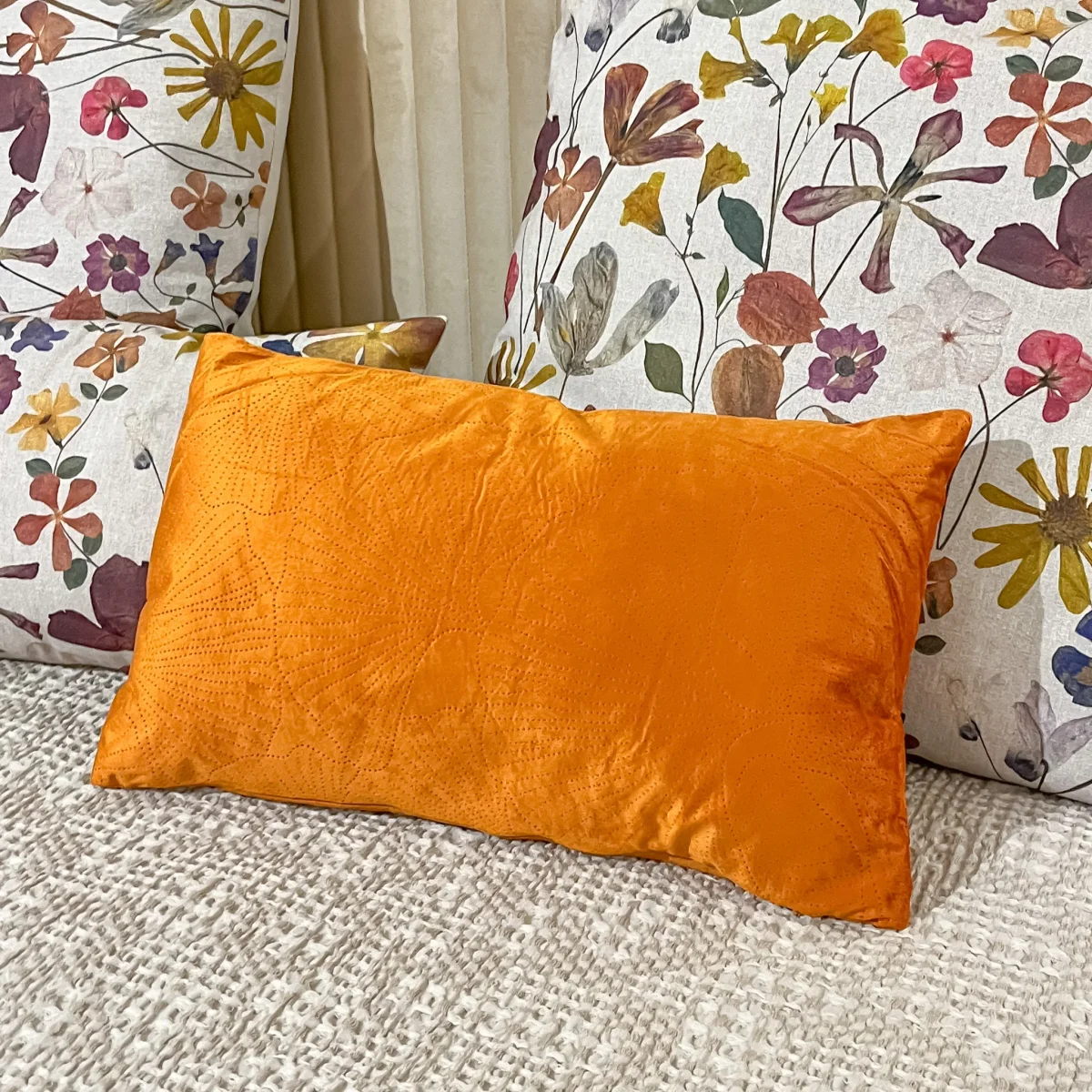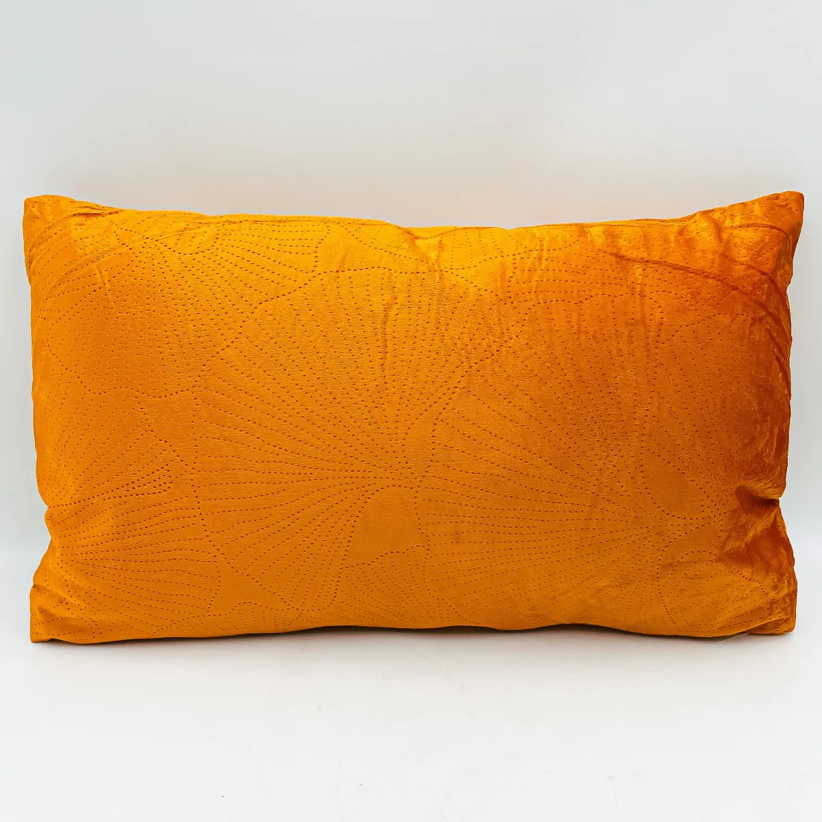 Un cojín naranja con estampado craquelado de flores. Un cojín de 30×50 ideal para frontales de cama o sofá, de tacto suave y mullido. Disponible también en color amarillo ¡Viene incluido el relleno, para que solo tengas que preocuparte de buscarle sitio en tu hogar!