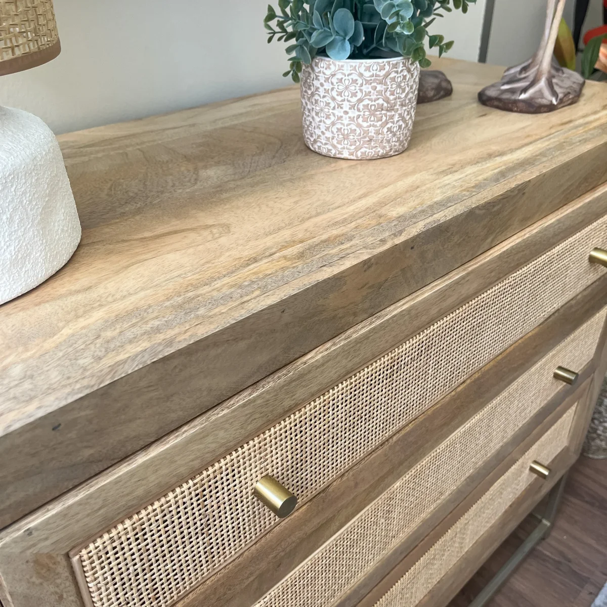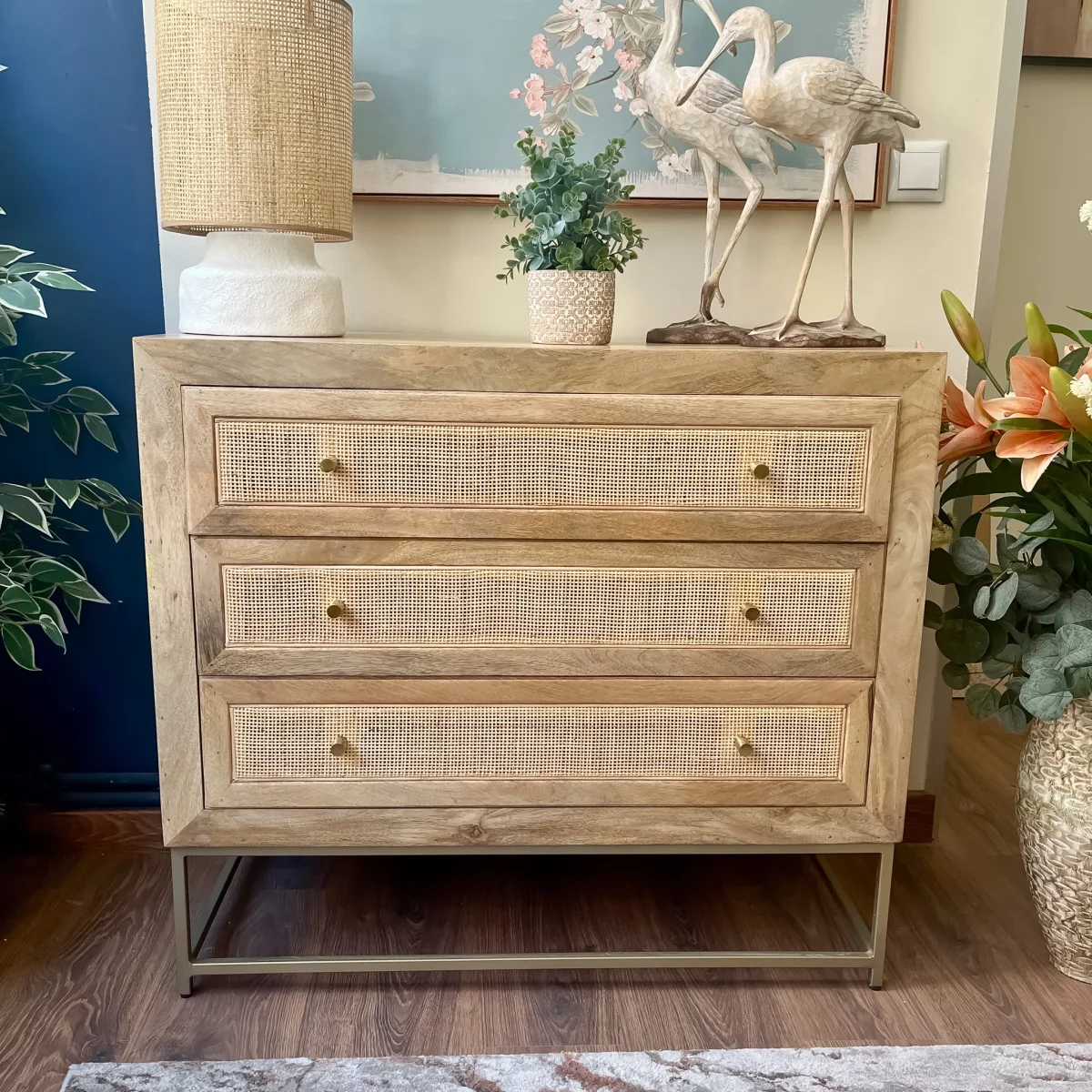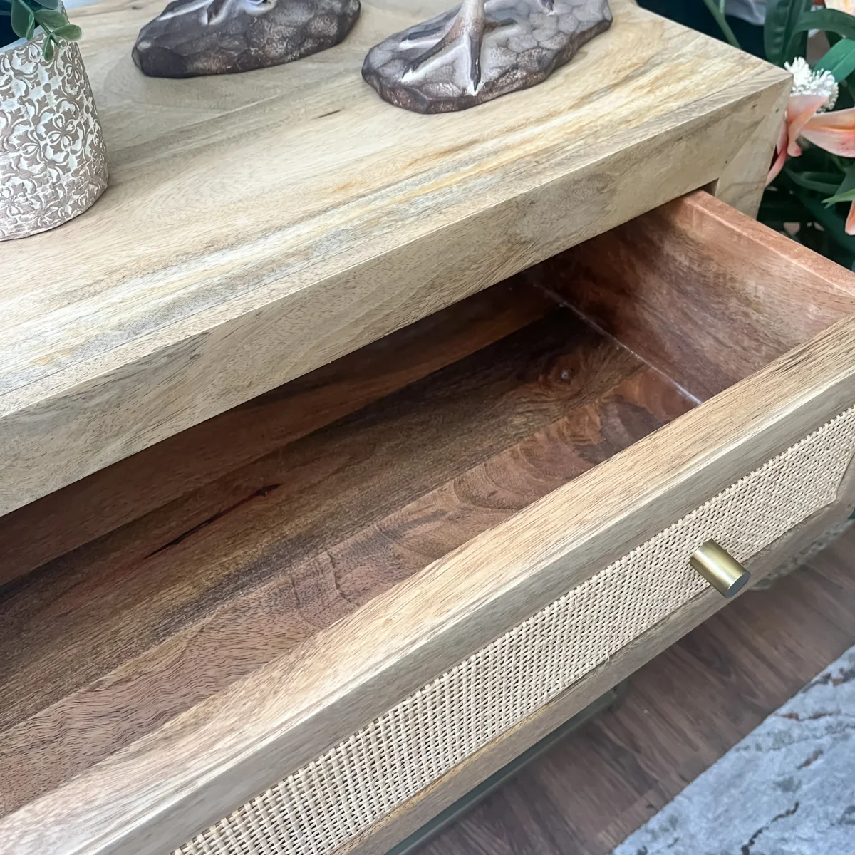 Una cómoda de diseño cálido y versátil en madera de mango con detalles en ratán natural. Sus tres cajones amplios ofrecen espacio para mantener todo en orden, mientras que el contraste con la base metálica dorada le aporta un aire ligero y actual. Una cómoda de madera de 90x40x81 funcional y decorativa que encaja en ambientes naturales, boho o contemporáneos.