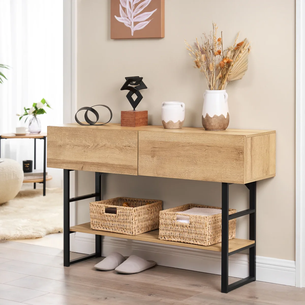 La elegante mesa de pasillo con dos amplios cajones ofrece suficiente espacio de almacenamiento para sus objetos personales. Ya sean llaves, correo u otros pequeños objetos, aquí encontrarán su lugar y estarán siempre al alcance.