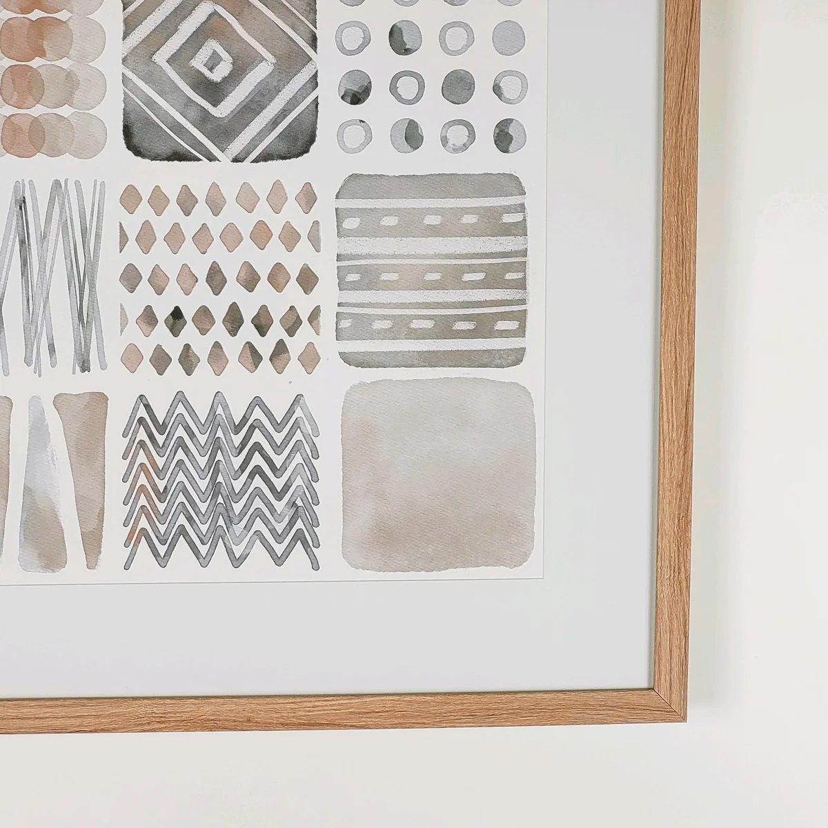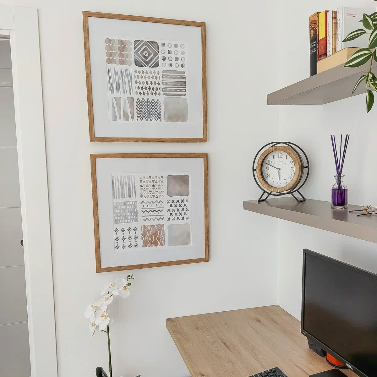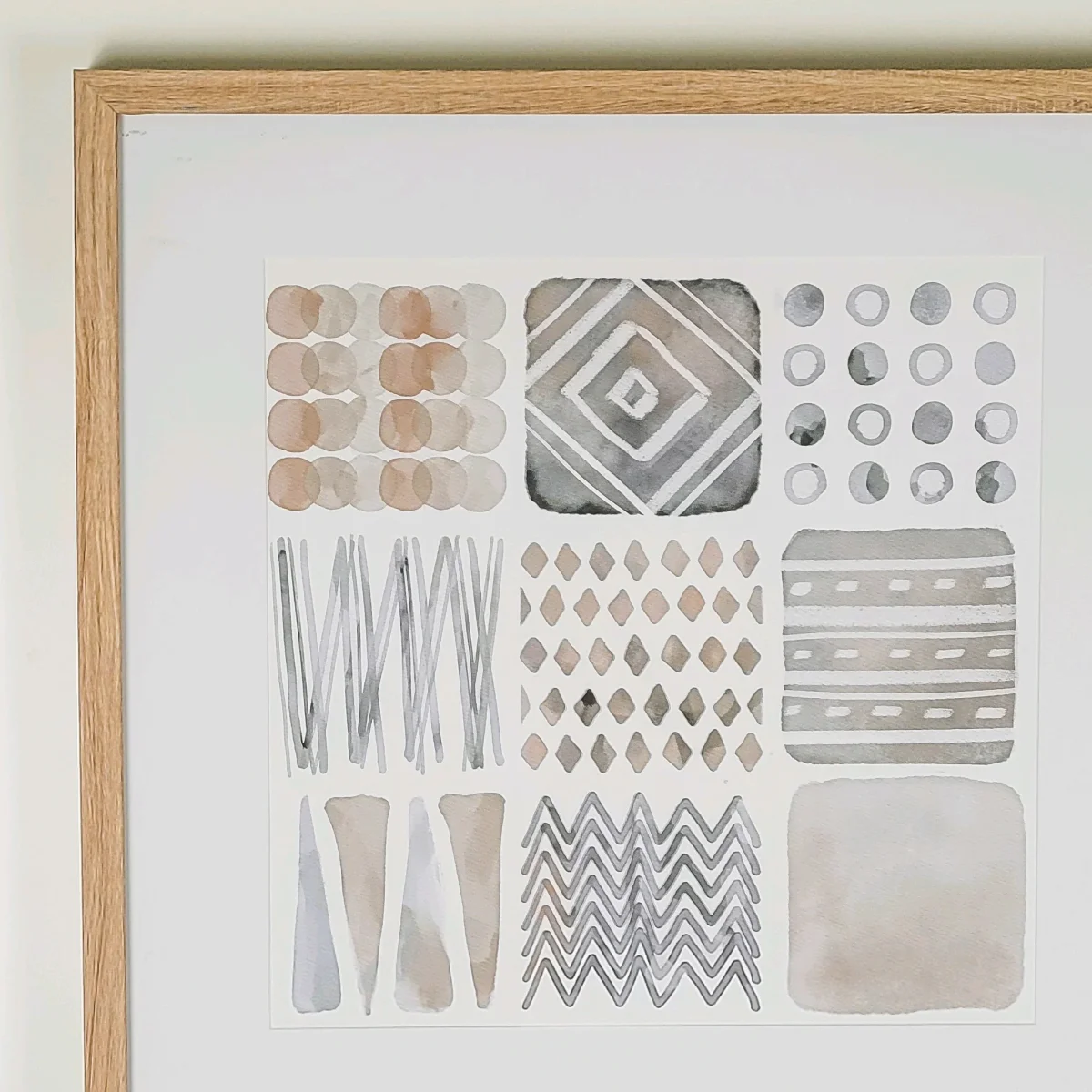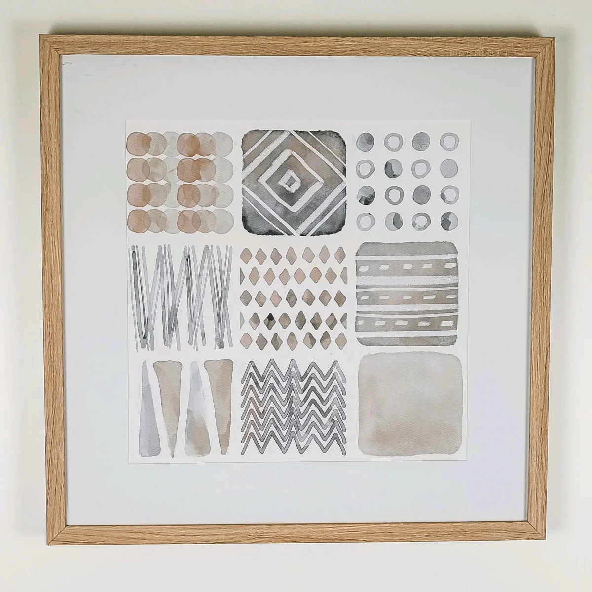 Un cuadro de figuras geométricas en tonos neutros con el que decorar las paredes de cualquier estancia: salón, comedor, dormitorio, etc. Un cuadro con marco de madera y fondo blanco, en el que destacan 9 secciones cuadradas con diseño geométrico. Un cuadro de 50×50 que combinará a la perfección con el cuadro de cristal figuras geométricas 2