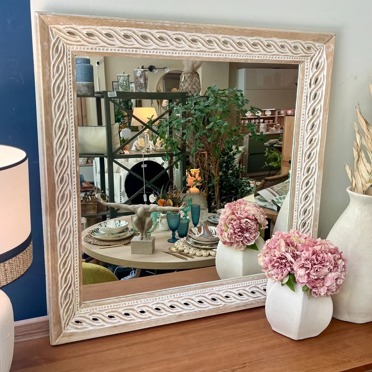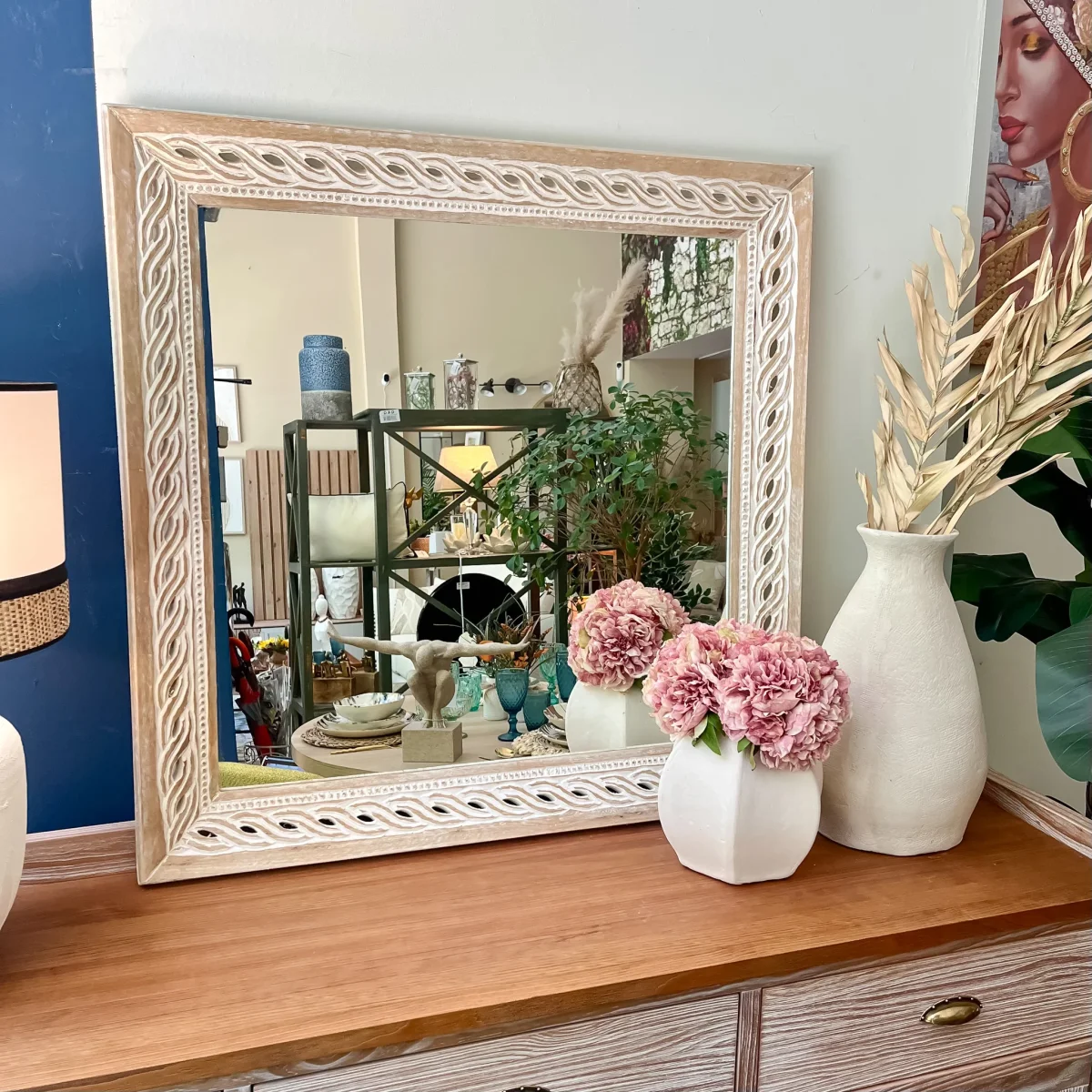 Llena de estilo y calidez tu hogar con este espejo de madera cuadrado de 92×92 y diseño original con marcos tallados trenzados en blanco. Es un espejo de madera de mango color natural, ideal para paredes amplias como comedores, recibidores o dormitorios de matrimonio. Un espejo cuadrado con el que llenar de estilo tu hogar, ¿No crees?