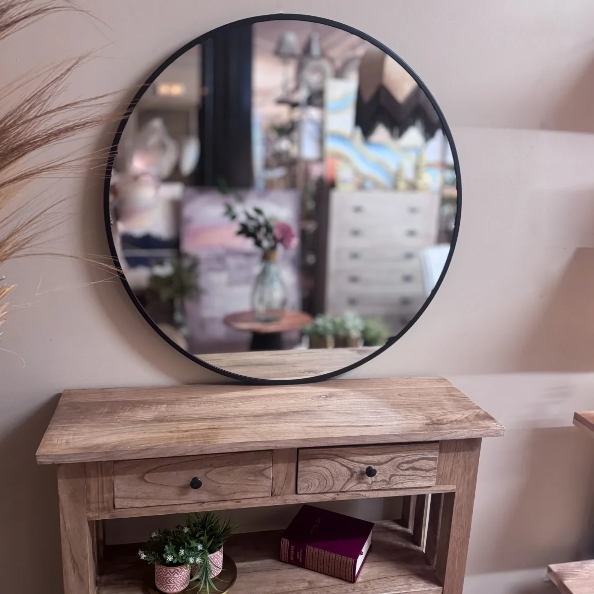 Está fabricado en hierro, lo que garantiza una durabilidad excepcional y una estructura firme que se asienta con seguridad en la pared, mientras que su perfil fino de solo 2 cm de fondo permite que el espejo se integre de forma discreta y sofisticada sin sobresalir excesivamente. Este espejo de metal negro no solo cumple una función práctica esencial en el día a día, sino que actúa como una ventana de luz que ayuda a clarificar los rincones más oscuros de la casa. Su diseño circular suaviza las líneas rectas del mobiliario, creando una atmósfera más equilibrada, orgánica y acogedora.