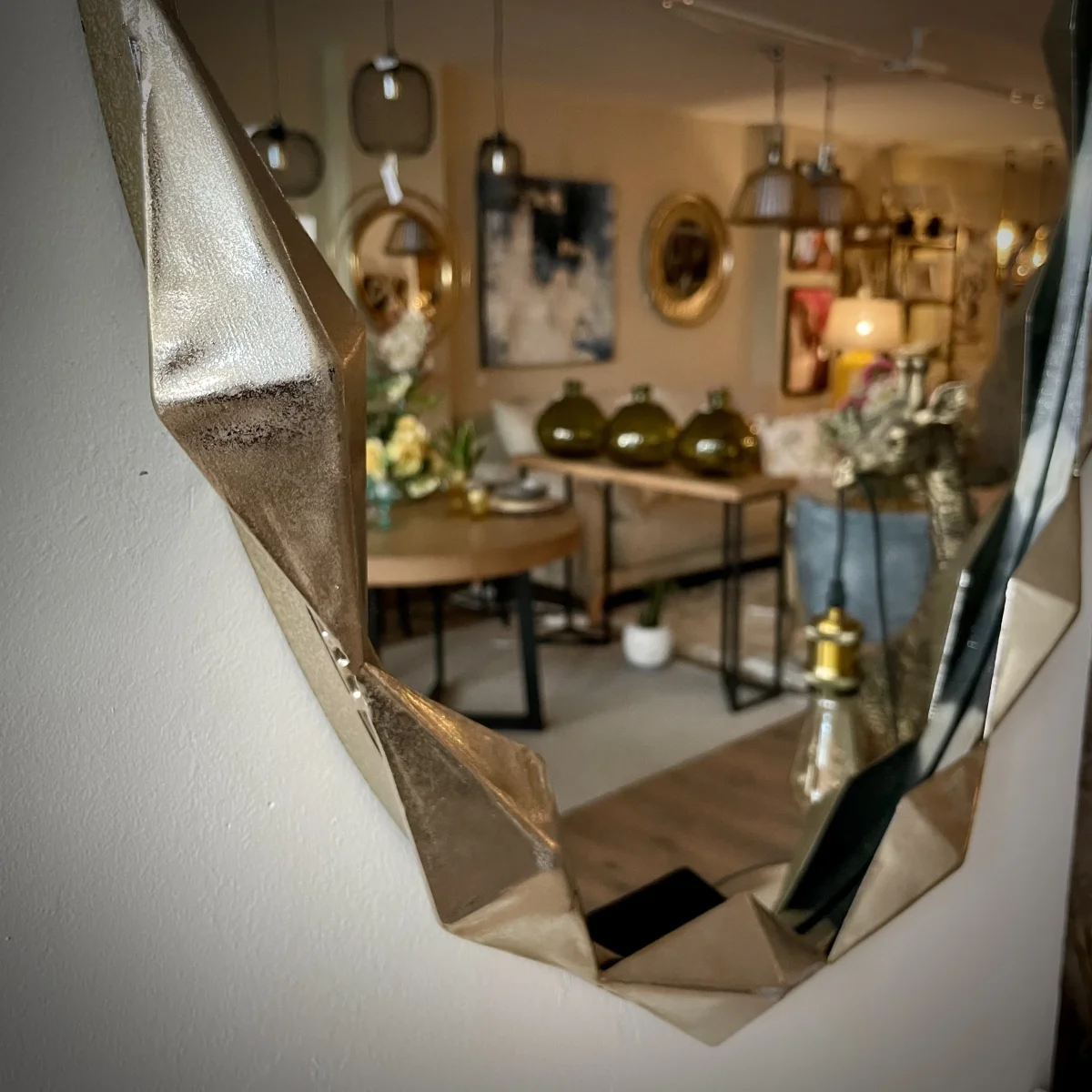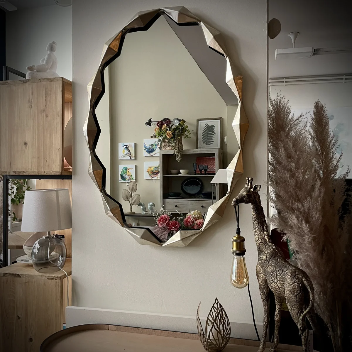 Un espejo moderno con mucha personalidad. Su diseño ovalado con marco geométrico dorado atraerá todas las miradas. Además es apto para cualquier espacio: recibidor, pasillo, salón o dormitorio, tú eliges.