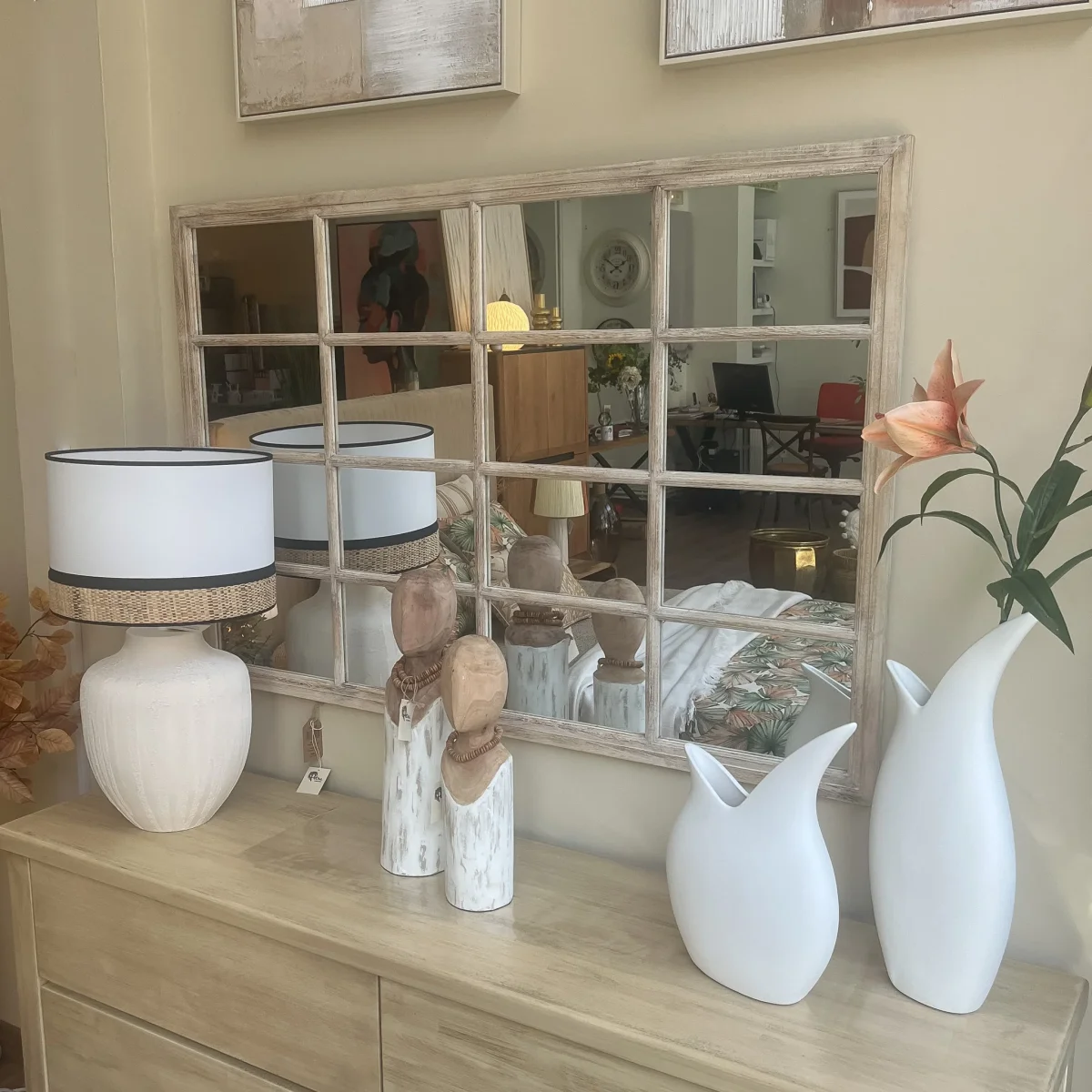 Este espejo rectangular combina el encanto rústico de la madera natural con un diseño de cuarterones que recuerda a las antiguas ventanas. Su estructura aporta calidez y estilo, mientras que sus dimensiones 86×126 permiten ampliar visualmente el espacio y potenciar la luz. Perfecto para colocar sobre consolas, aparadores o en el recibidor, creando ambientes acogedores y llenos de personalidad. Disponible en color madera oscura. Posibilidad de colocar en horizontal y vertical, ya que tiene colgadores para las dos posiciones.