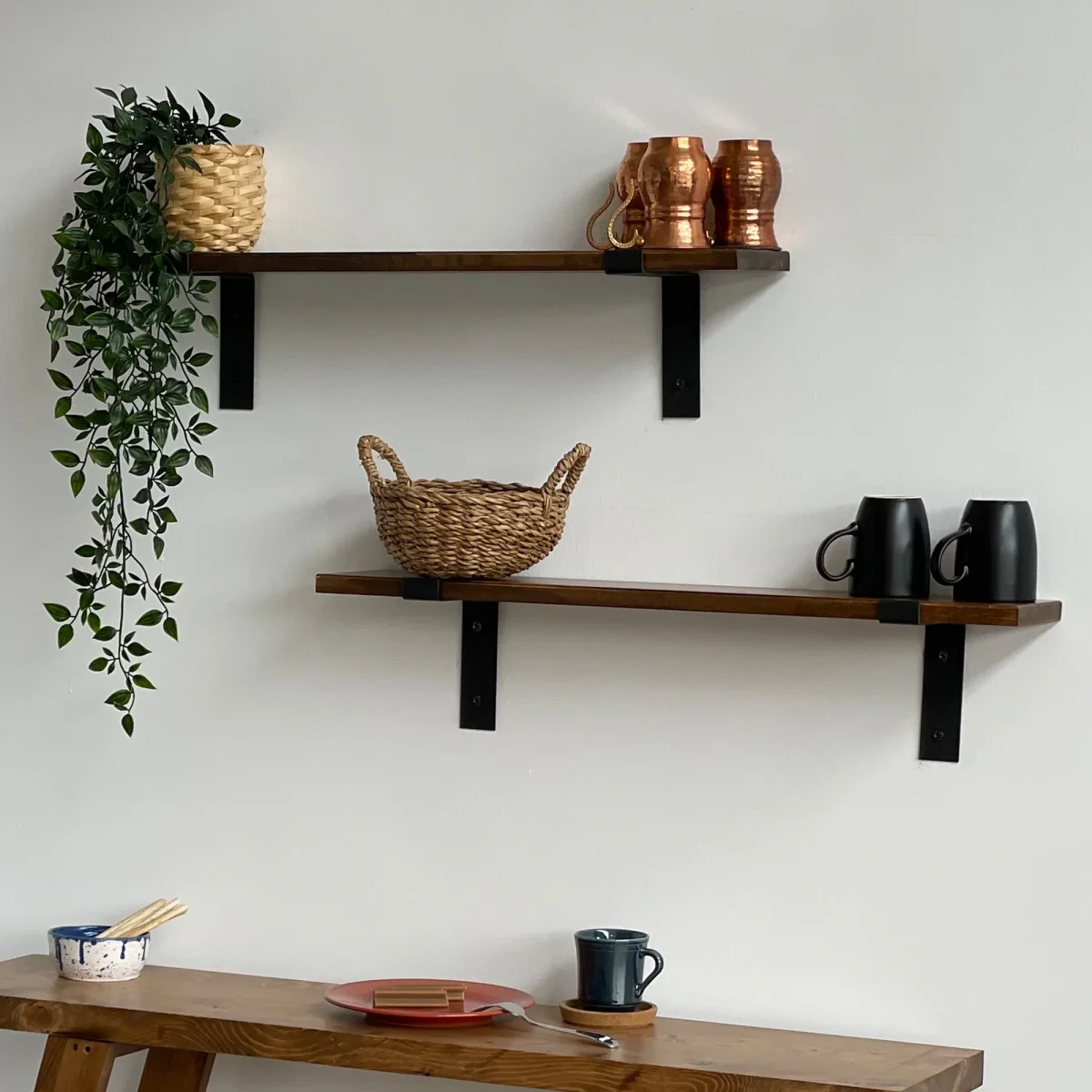 El estiloso conjunto de estanterías de pared es un verdadero punto de atracción en su sala de estar y ofrece espacios ideales para guardar sus utensilios.