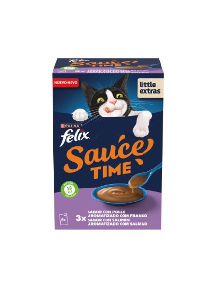 Es una salsa para gatos adultos en diferentes variedades de sabor con pollo y salmón que viene en un pack que contiene 6 sobres de 40g: