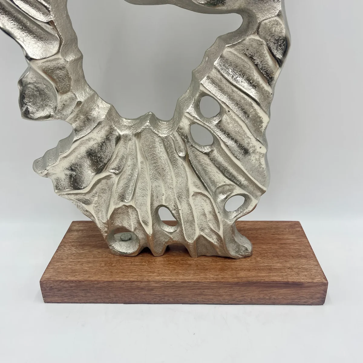 Esta figura decorativa combina metal y madera en un diseño abstracto lleno de carácter. Su acabado texturizado y las formas irregulares crean un juego de luces y sombras que añade profundidad visual. La base de madera aporta contraste y estabilidad, convirtiéndola en una pieza versátil para decorar consolas, aparadores o estanterías. Una figura plateada con unas dimensiones de 28x12x54 cm, es perfecta para dar un toque artístico y moderno a cualquier espacio.