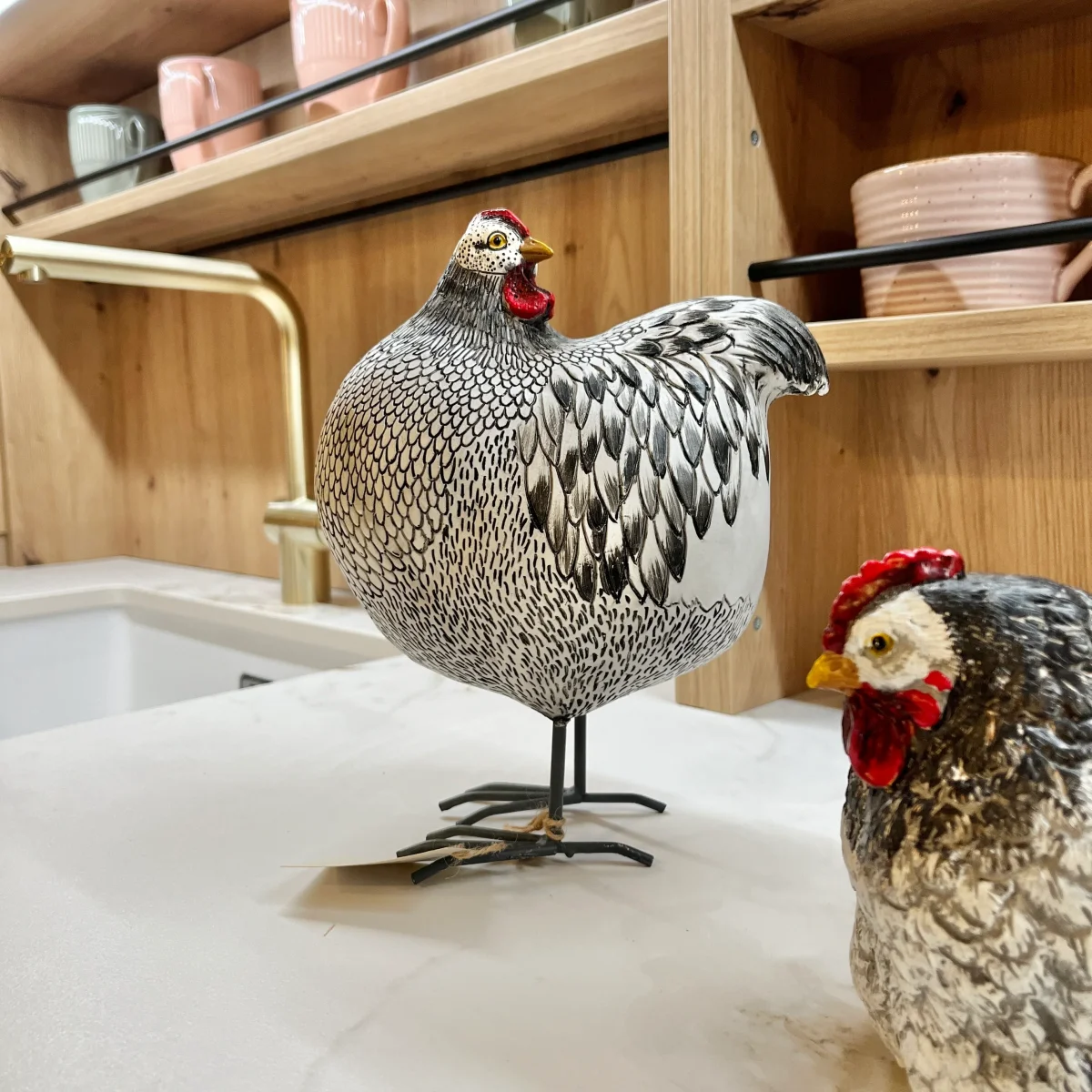 Una figura decorativa original, hecha de resina en colores blanco y negro, con las patas de metal. Un diseño original de estilo rústico que quedará perfecto en bodegas, cocinas y restaurantes. Elige entre los diferentes diseños de figuras de gallina que tenemos y elige la que más te guste.