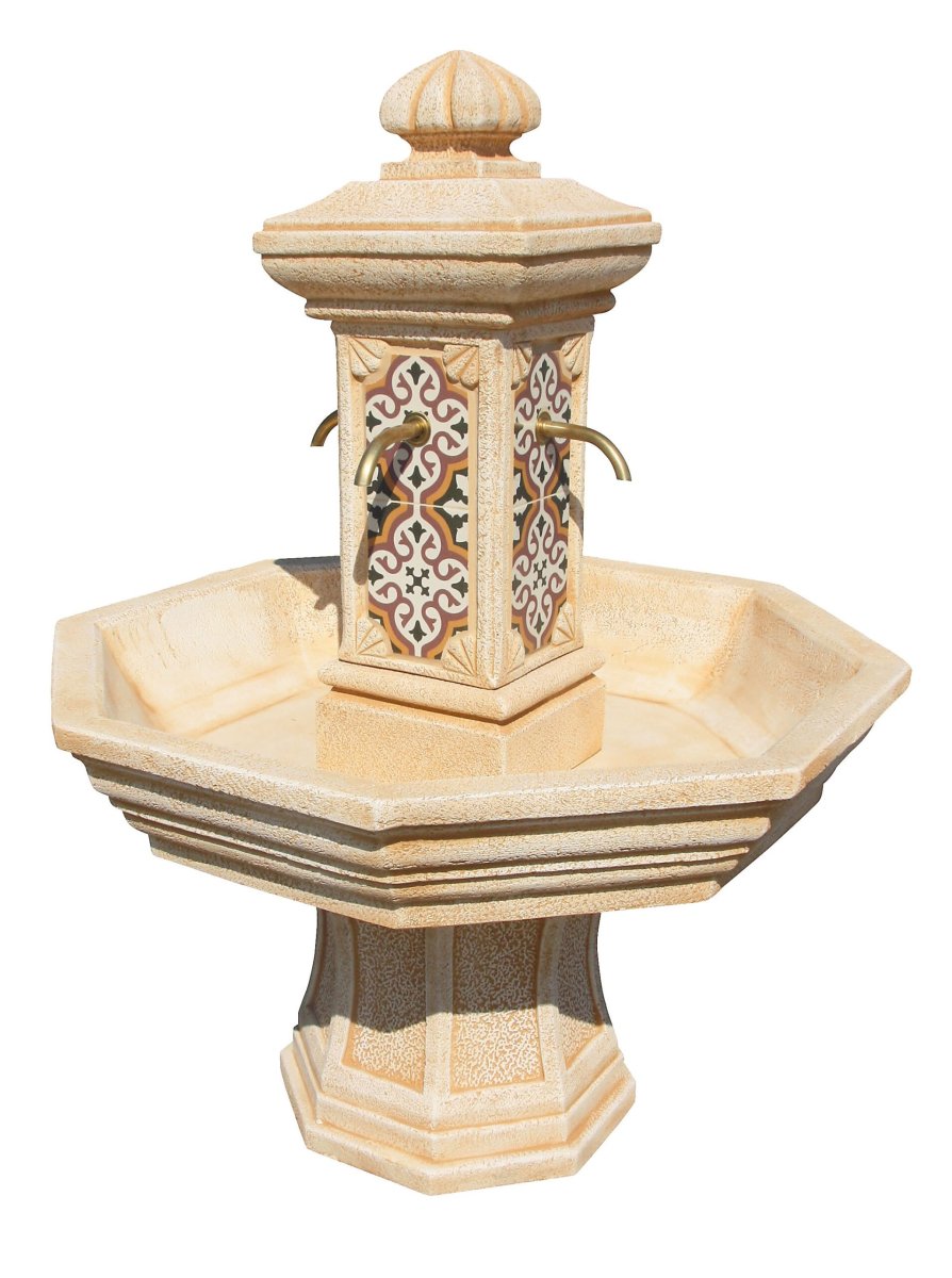 Fuente de jardín con azulejos modelo DELFOS, compuesta por una base, pica y un poste central con 4 salidas de agua.