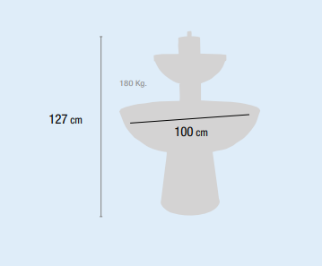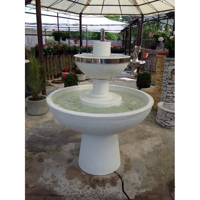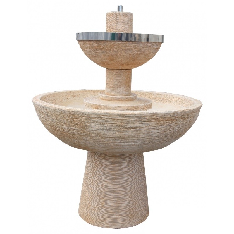 Esta fuente de jardín viene en color ocre y también en color blanco aparte de que el borde del cuenco superior esta revestido con cinta Inox.