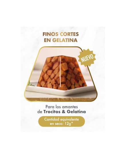 Un alimento elaborado con ingredientes de alta calidad y con mucha carne para satisfacer la naturaleza carnívora de los felinos. Rico en proteínas, vitaminas y minerales para cubrir las necesidades nutricionales diarias de tu gato. Estas recetas «Gelatina con trocitos» son 100% completas y equilibradas, por lo que no tendrás que preocuparte por nada. Puedes utilizarlas como alimento completo o junto al pienso. Además, no contienen conservantes, colorantes ni aromatizantes artificiales añadidos.