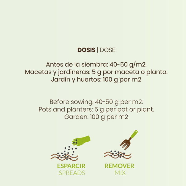 Esparcir y remover:Antes de siembra: 40-50 g/m². Maceta: 5 g. Jardín y huertos: 100 g/m². Una vez al año.