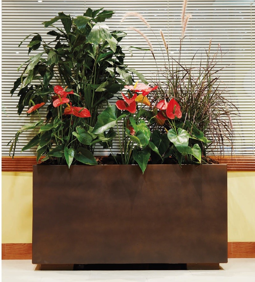 «description»: «Jardinera grande de hormigón y piedra artificial para exterior e interior, resistente a la intemperie y con gran capacidad de tierra.»,