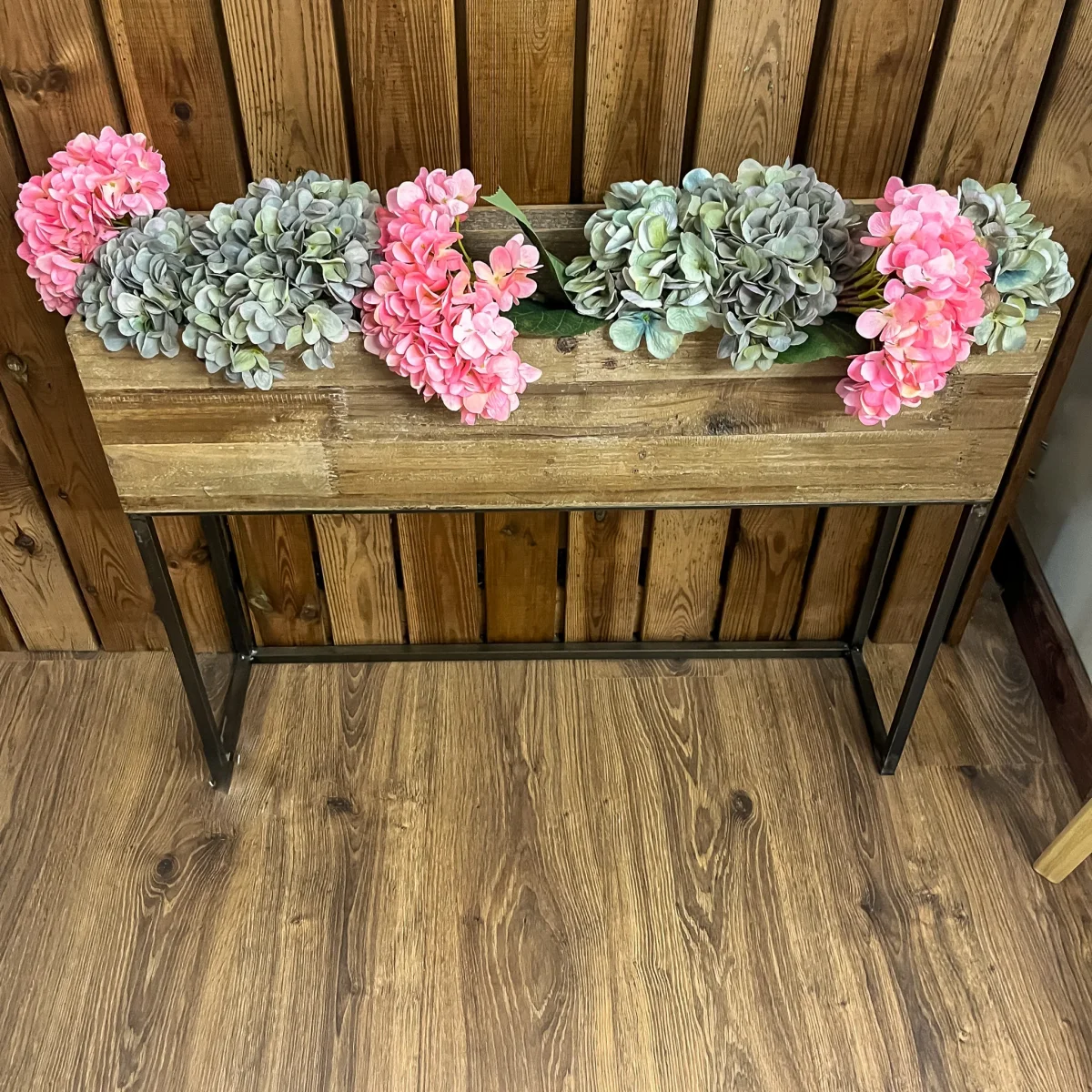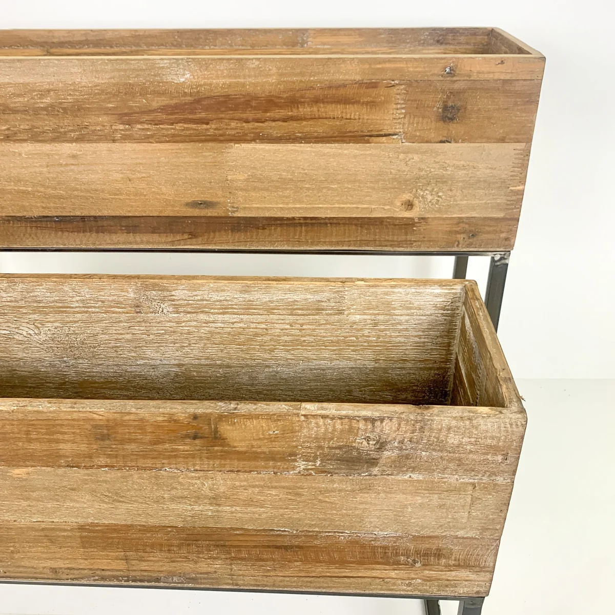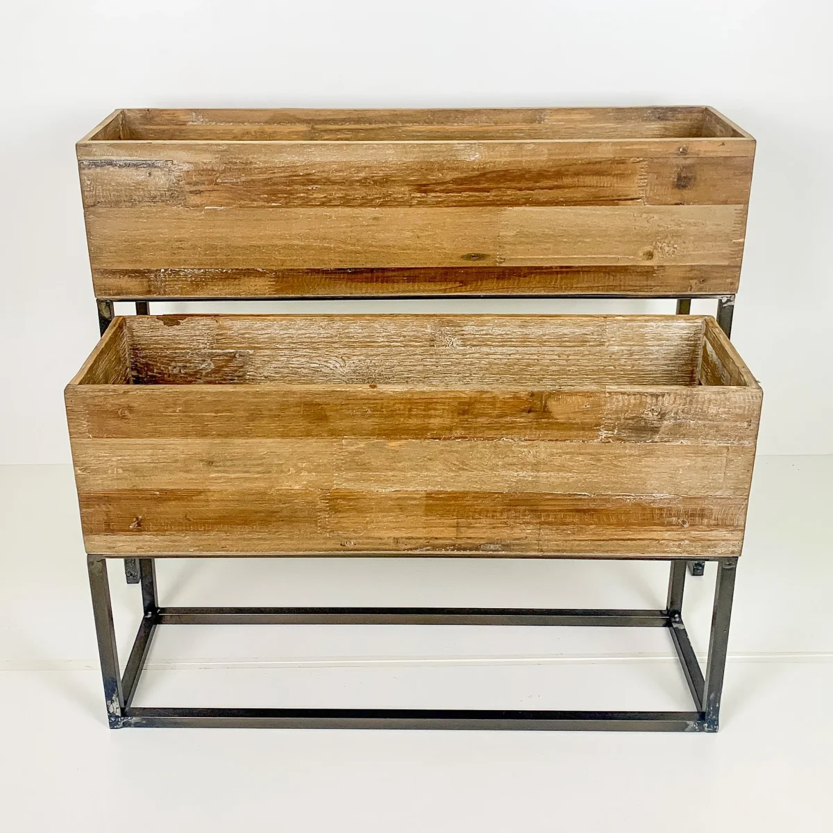 Este set de jardineras elevadas combina madera natural envejecida con una estructura metálica negra, creando una pieza decorativa de estilo industrial y cálido. Su diseño rectangular y elevado resulta ideal para colocar plantas naturales o artificiales, aportando un toque verde sin ocupar demasiado espacio en el suelo.