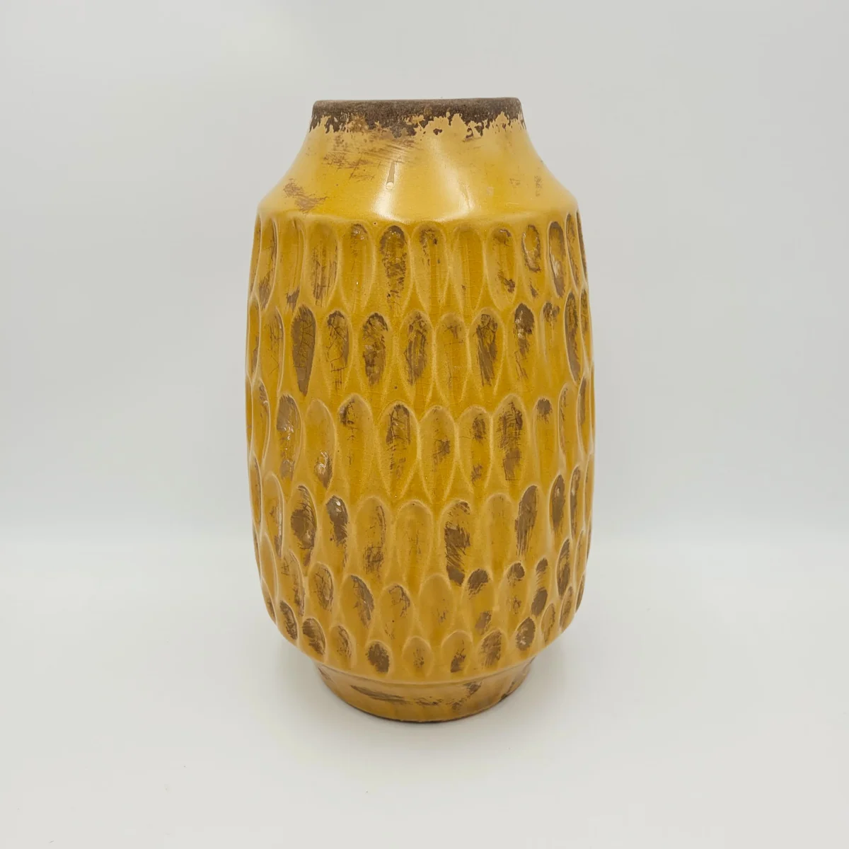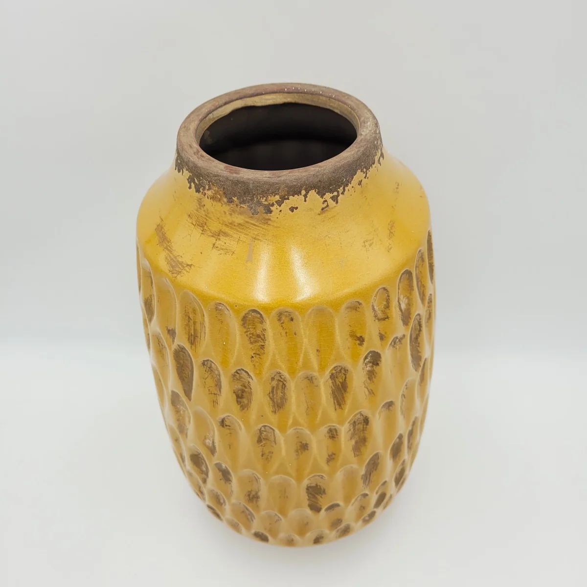 Este jarrón de cerámica mostaza tiene un diseño con texturas y desgastado que le da un toque vintage. Quedará ideal para ambientes rústicos y vintage. Colócalo en el salón, dormitorio o entrada, tú eliges. Combínalo con el jarrón marrón dorado a juego y crea composiciones originales.