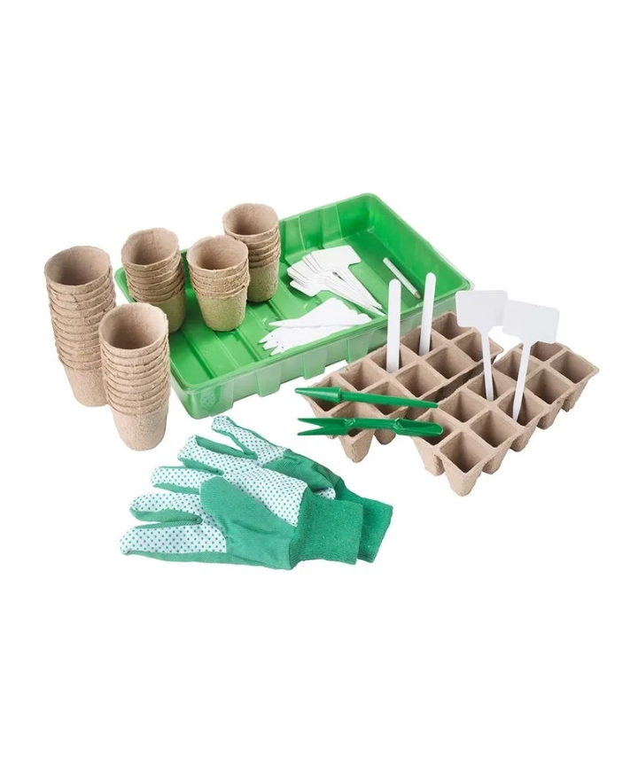 Kit para cultivar. Compuesto por bandeja plástica con tapa, almacigueras biodegradables, macetas biodegradables, guantes de jardinería, cartelitos, y pequeñas herramientas.