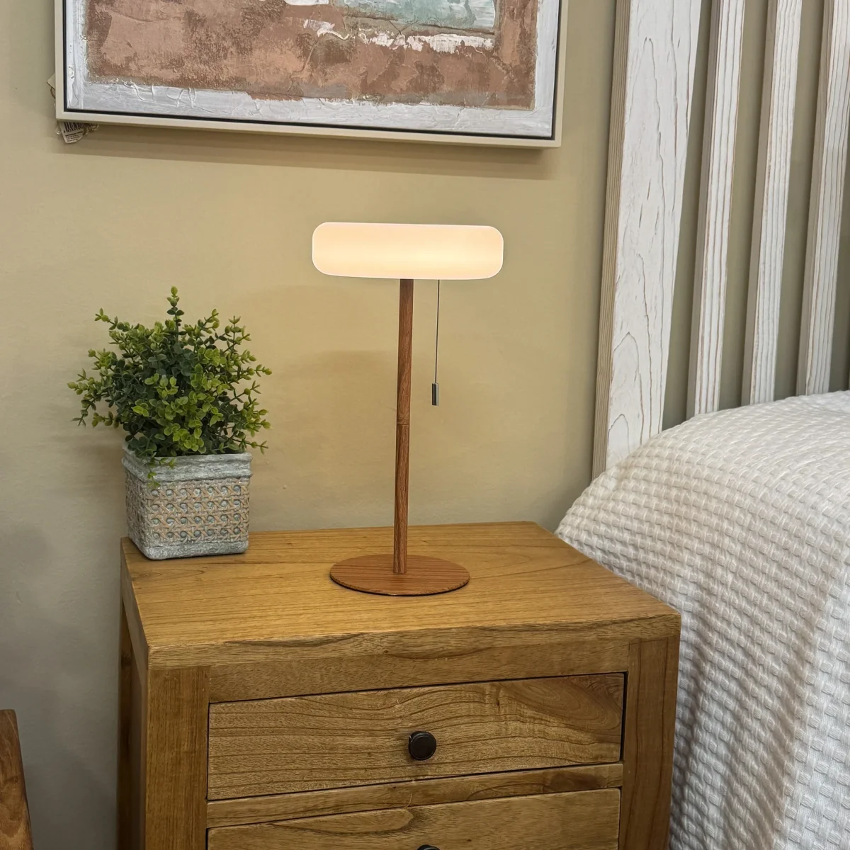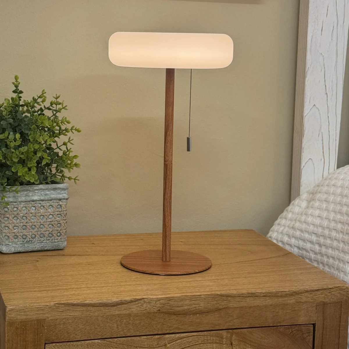 Con unas dimensiones de 16 cm de diámetro y 32 cm de altura, este modelo destaca por su discreción estética, integrándose sin esfuerzo en decoraciones de estilo nórdico o contemporáneo. Su gran ventaja reside en su total autonomía: al ser inalámbrica y recargable por USB, puedes moverla con total libertad sin depender de enchufes cercanos. El uso de metal de alta calidad garantiza una pieza ligera y resistente. Además, el detalle del interruptor de cadena colgante añade un matiz retro que contrasta con su moderna tecnología, facilitando su uso en cualquier rincón de lectura o descanso.
