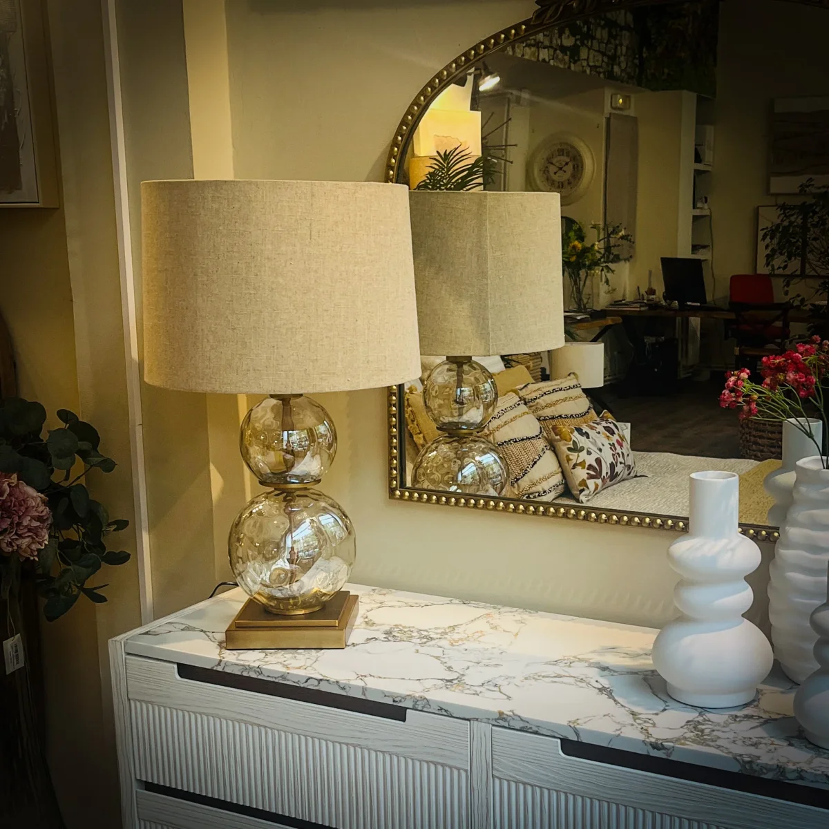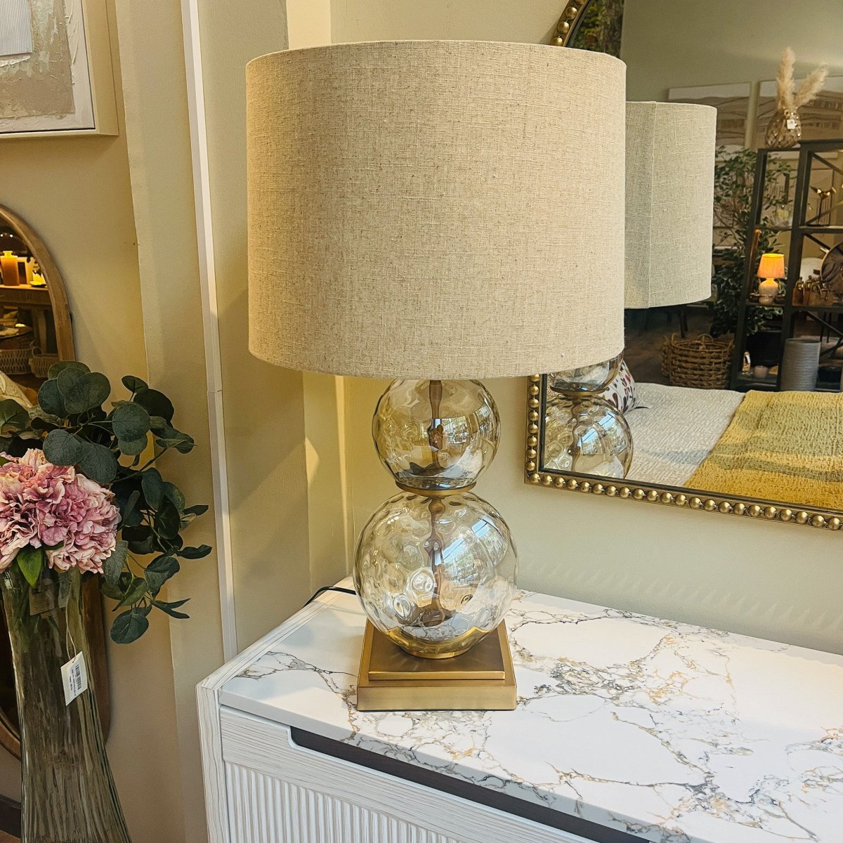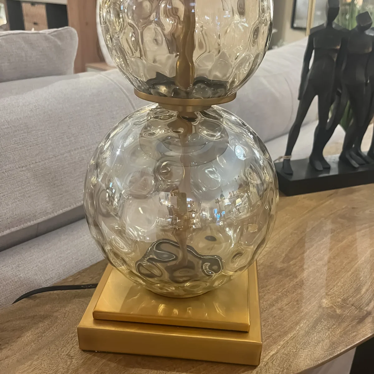 Ilumina tu espacio con esta elegante lámpara de sobremesa, que destaca por su base de cristal con textura de esferas dobles y un sutil toque dorado en la base. La pantalla en tonos neutros suaviza la luz, creando una atmósfera acogedora y sofisticada. Perfecta para colocar en salas de estar, dormitorios o cualquier rincón que necesite un toque de estilo y calidez. Una lámpara de sobremesa de 40.5×40.5x69cm fabricada en metal color dorado, cristal y pantalla de lino.