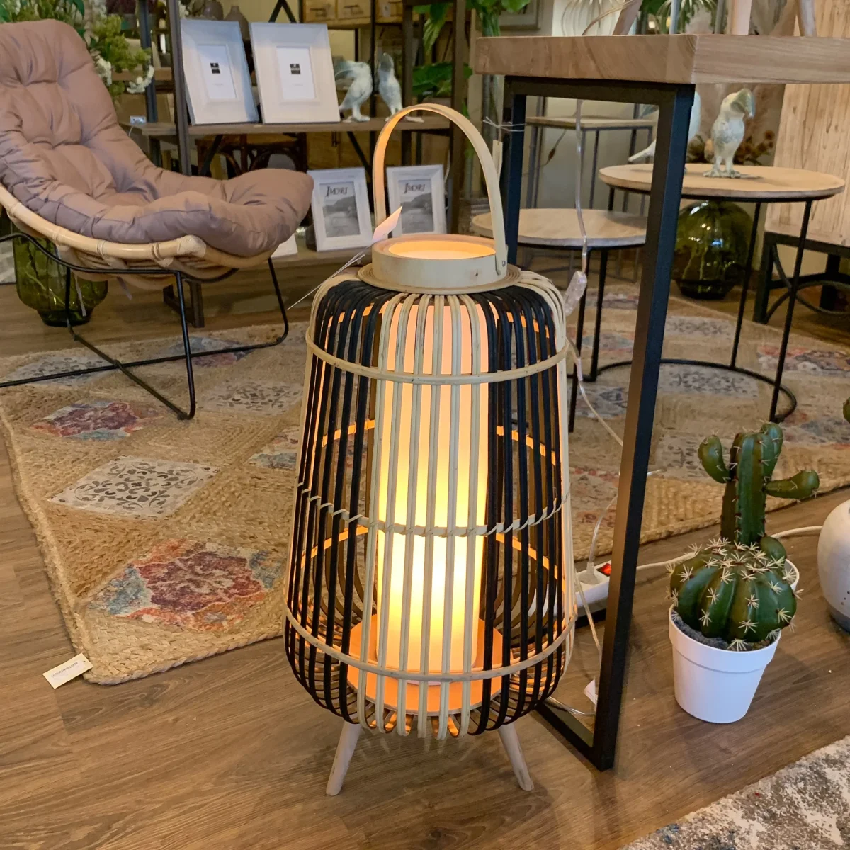 Las lámparas de bambú son tendencia y harán que tus ambientes luzcan de manera especial. Esta lámpara está fabricada en bambú y fibras sintéticas, en color natural y negro, ideal para combinar con cualquier estilo decorativo. Un farolillo eléctrico apto para interiores y exteriores, ideal para decoración de jardín y terraza. Combínala con el tamaño 30x30x56 para iluminar con estilo y personalidad tu hogar.