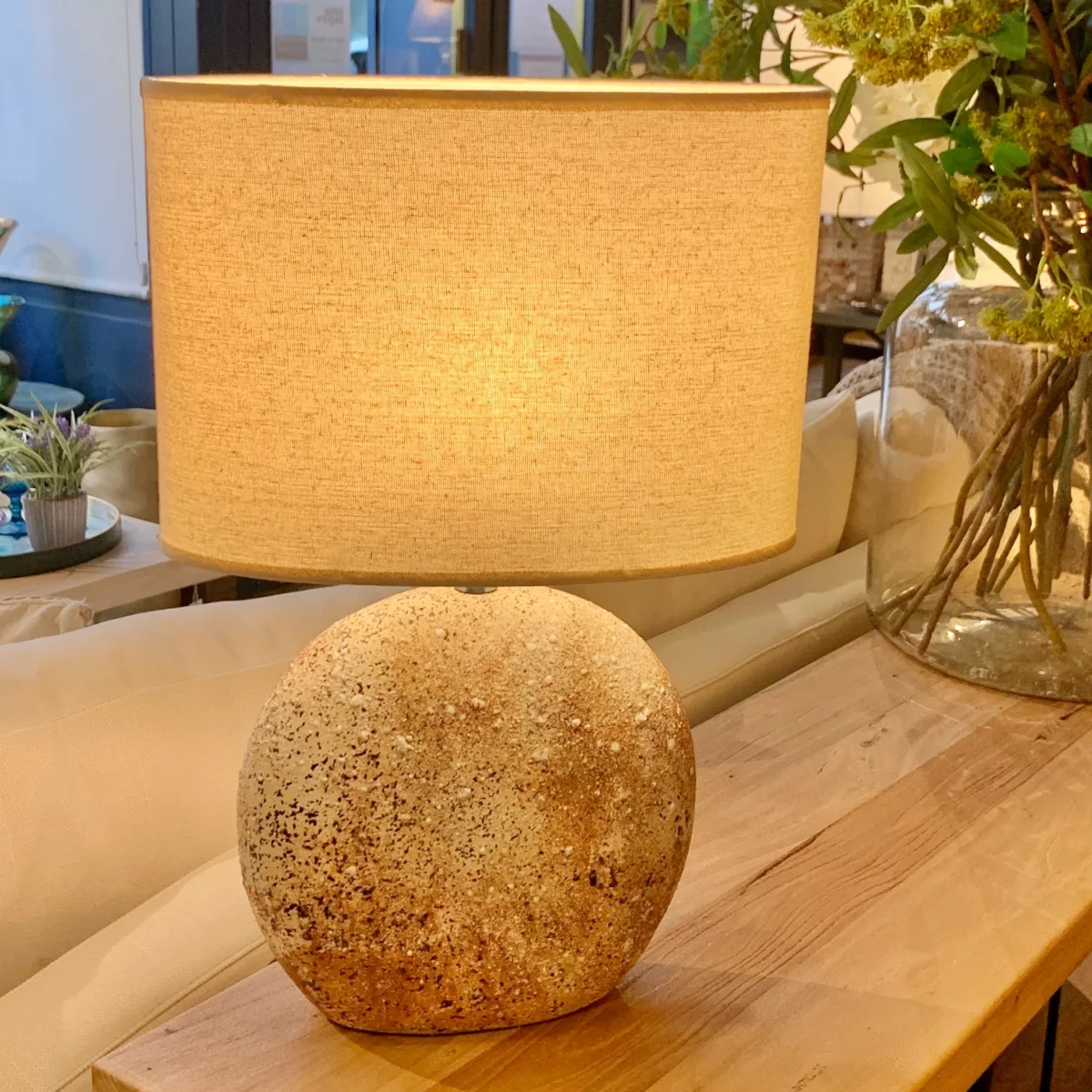 Una lámpara de sobremesa elegante y clásica. Una lámpara de mesa de cerámica con textura en relieve color cobrizo llena de estilo y elegancia. La pantalla es de lino en color natural de forma redonda. Tiene unas dimensiones 34x16x51 ideales para colocar en el salón o comedor, en la entrada o en un rincón de lectura y llenará por si sola la estancia de estilo.