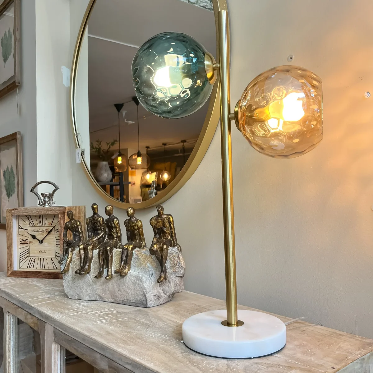 Una lámpara de cristal y metal dorado con pie de melanina beige. Una lámpara de sobremesa llena de estilo y elegancia con la que decorar tu hogar. Aportará un toque Glam a tu dormitorio, salón, pasillo o rincón de lectura, ya que su versatilidad hará que la puedas colocar en cualquier rincón. Dimensiones 18x35x60. Poténciala con luz amarilla para crear un ambiente cálido y acogedor.