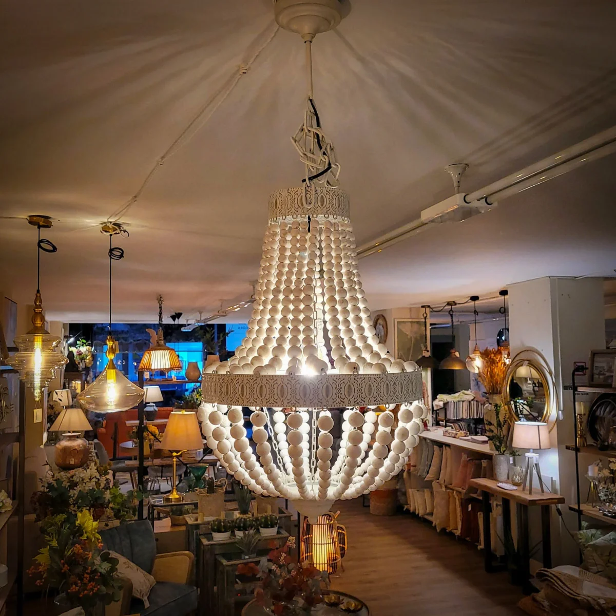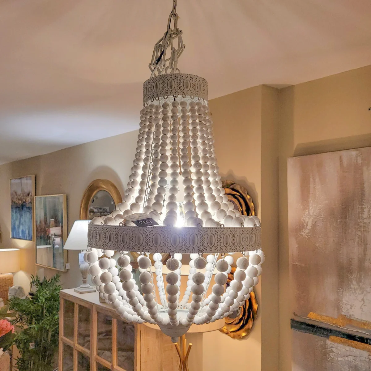 Una lámpara de techo vintage fabricada en madera y metal. Su diseño está inspirado en las lámparas antiguas de bolas que colgaban en los grandes salones de celebraciones. Una lámpara estilo clásico vintage con la que darle un toque de personalidad a tu estancia.