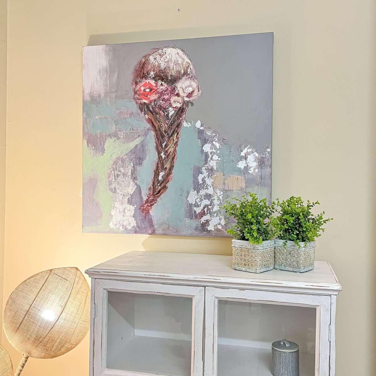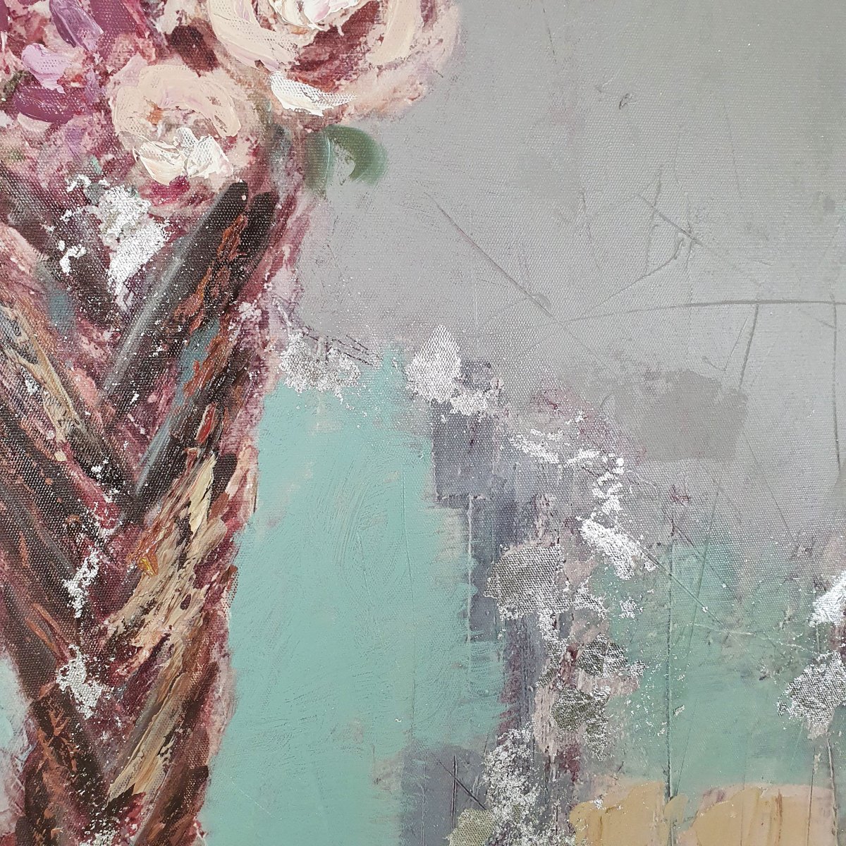 Un lienzo de mujer colorido y femenino. Un cuadro de 80×80 con el que transmitir feminidad y belleza a partes iguales. Un lienzo en el que predominan tonos azules, rosas y blancos. Colócalo en el dormitorio, salón o pasillo, tú eliges.
