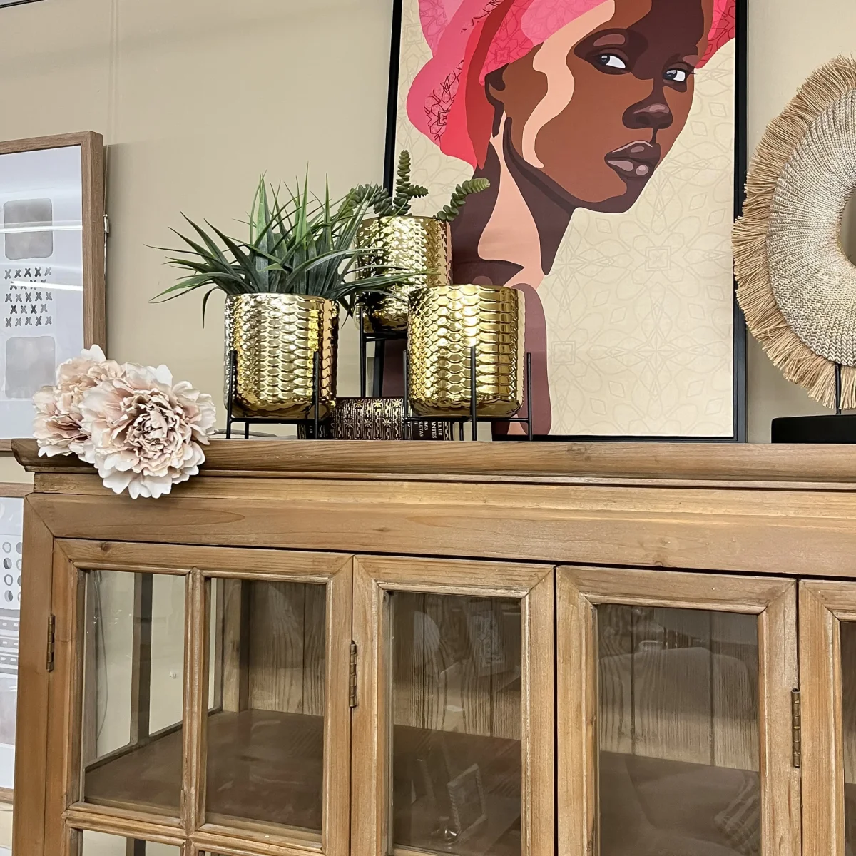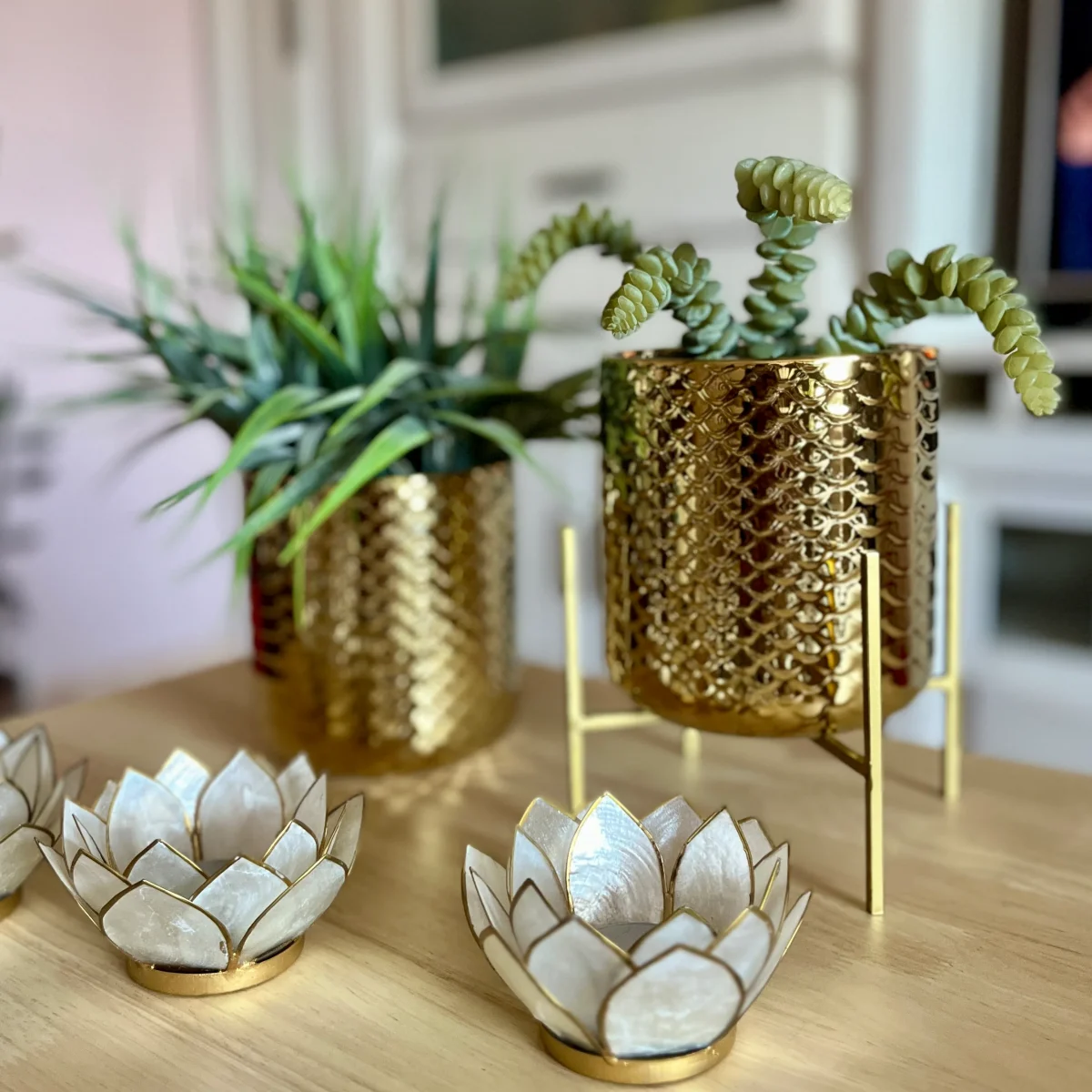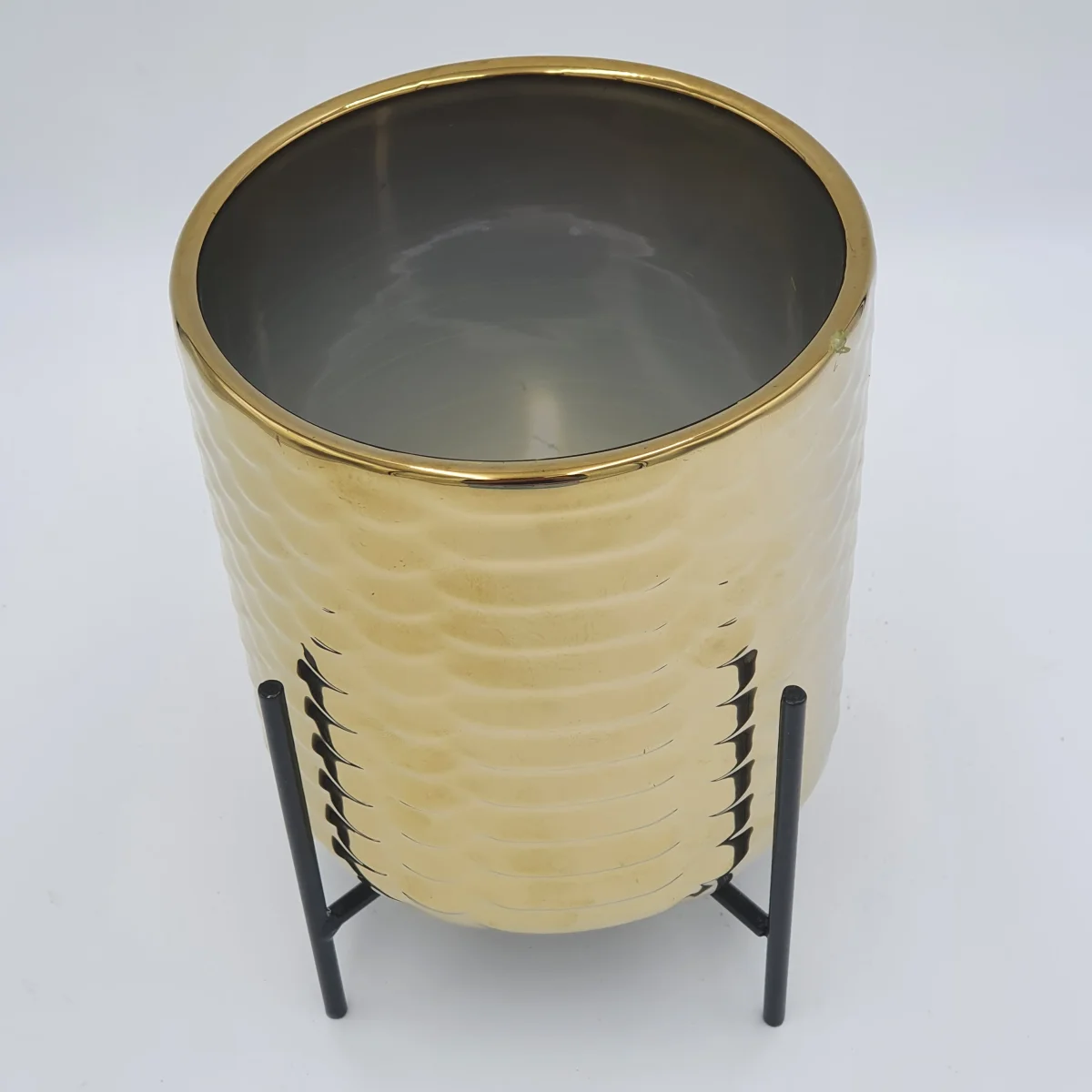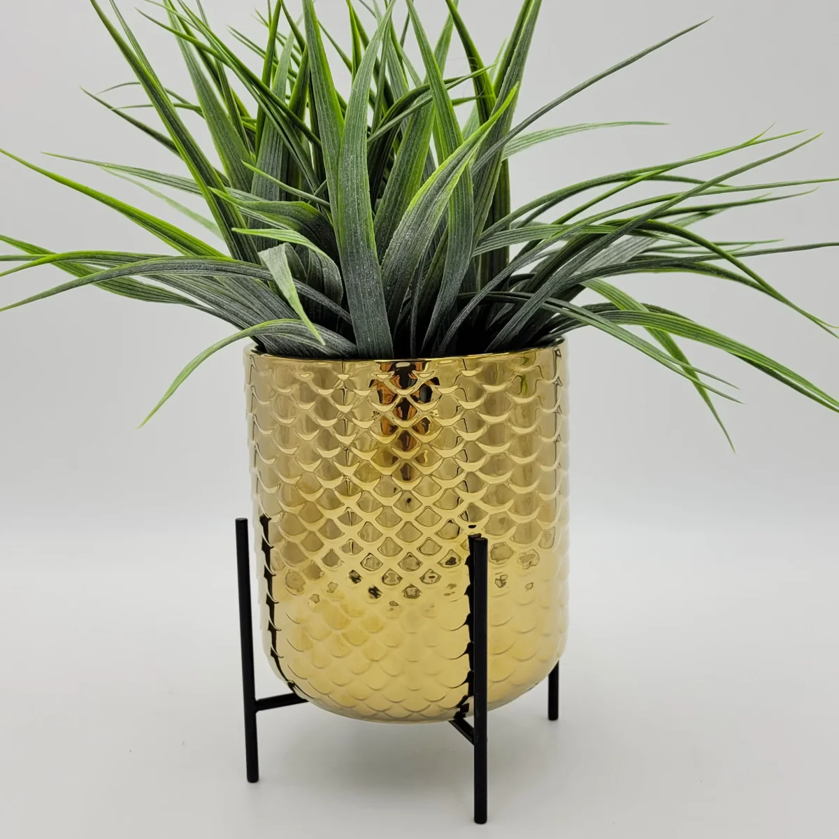 ¡Tus plantas se van a enamorar con este macetero dorado! Añade un toque moderno y luminoso a tu hogar con este macetero de metal dorado y pie en negro. Un macetero con mucha personalidad que puedes colocar en cualquier parte: en el suelo, en una estantería o sobre un mueble… tú eliges. No incluye la planta.