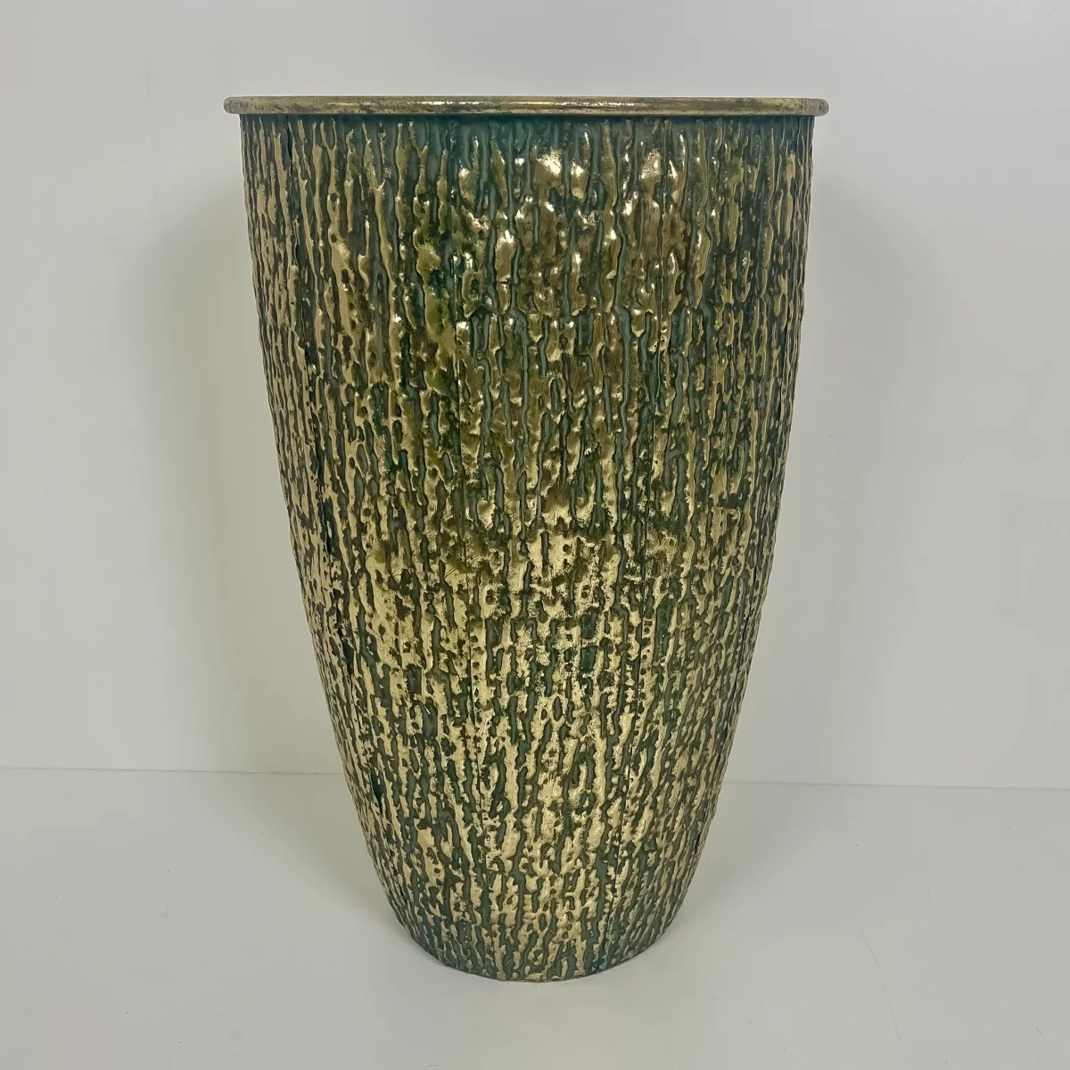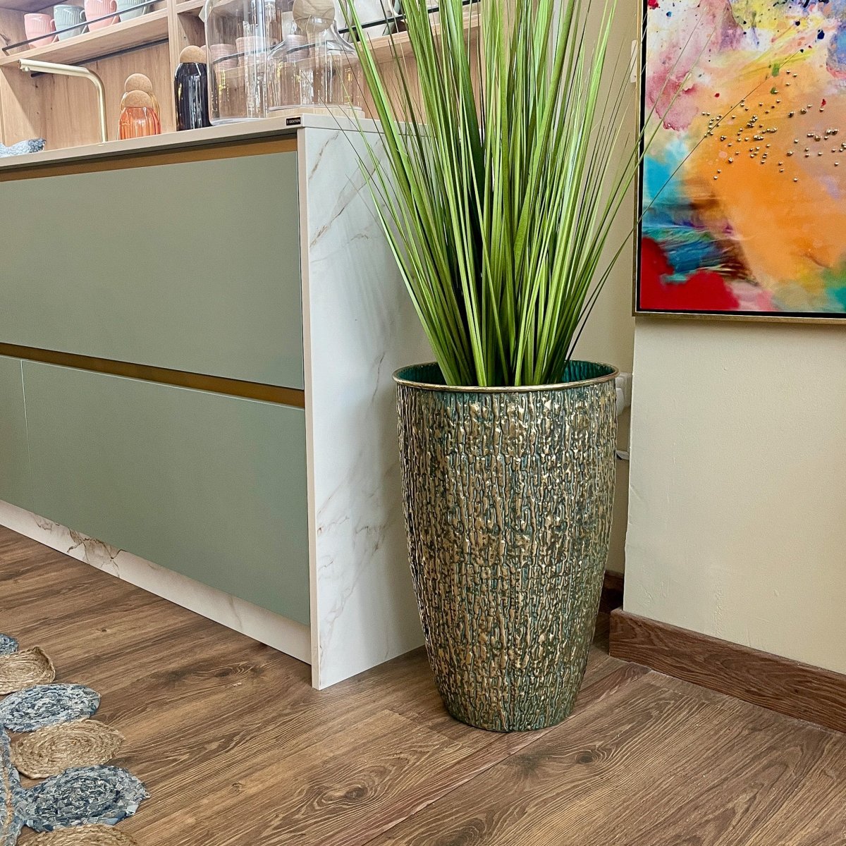El modelo Bursa es un macetero decorativo de metal con textura y acabado en tonos verdosos y dorados. Su diseño alto y elegante lo convierte en el complemento perfecto para resaltar plantas de interior o exterior con estilo. Su interior esmaltado en verde le aporta un toque distintivo y sofisticado. Ideal para dar un aire moderno y natural a cualquier rincón del hogar. Un macetero decorativo de 34x34x54 cm disponible en dos tamaños más, para adaptarse a diferentes espacios y combinaciones.