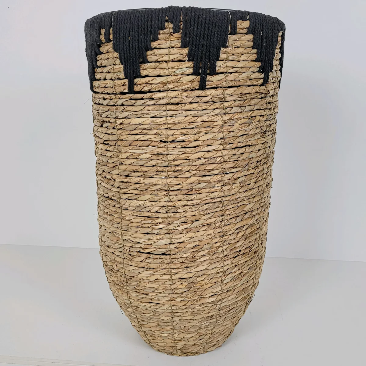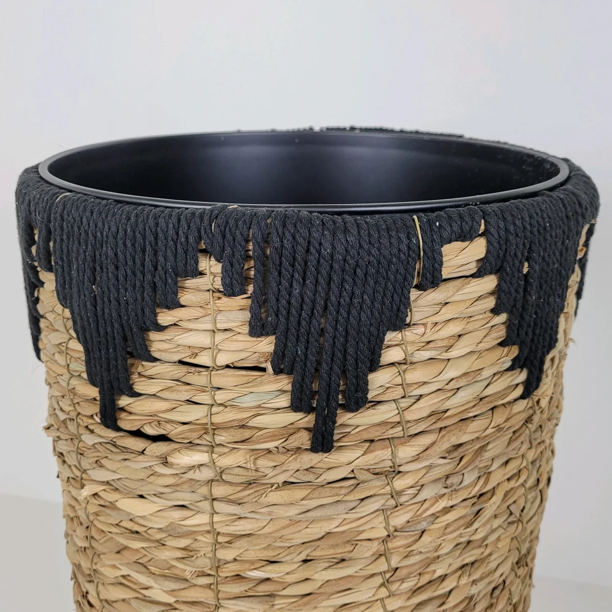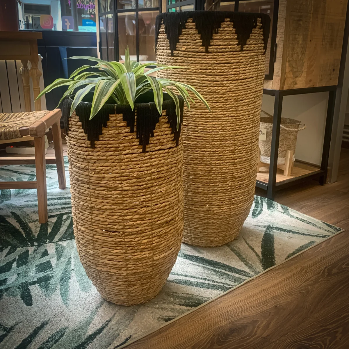 Un macetero de mimbre con borde geométrico tejido negro. Ideal para plantas y árboles altos. Combínalo con el tamaño de 38×81 y crea composiciones originales.