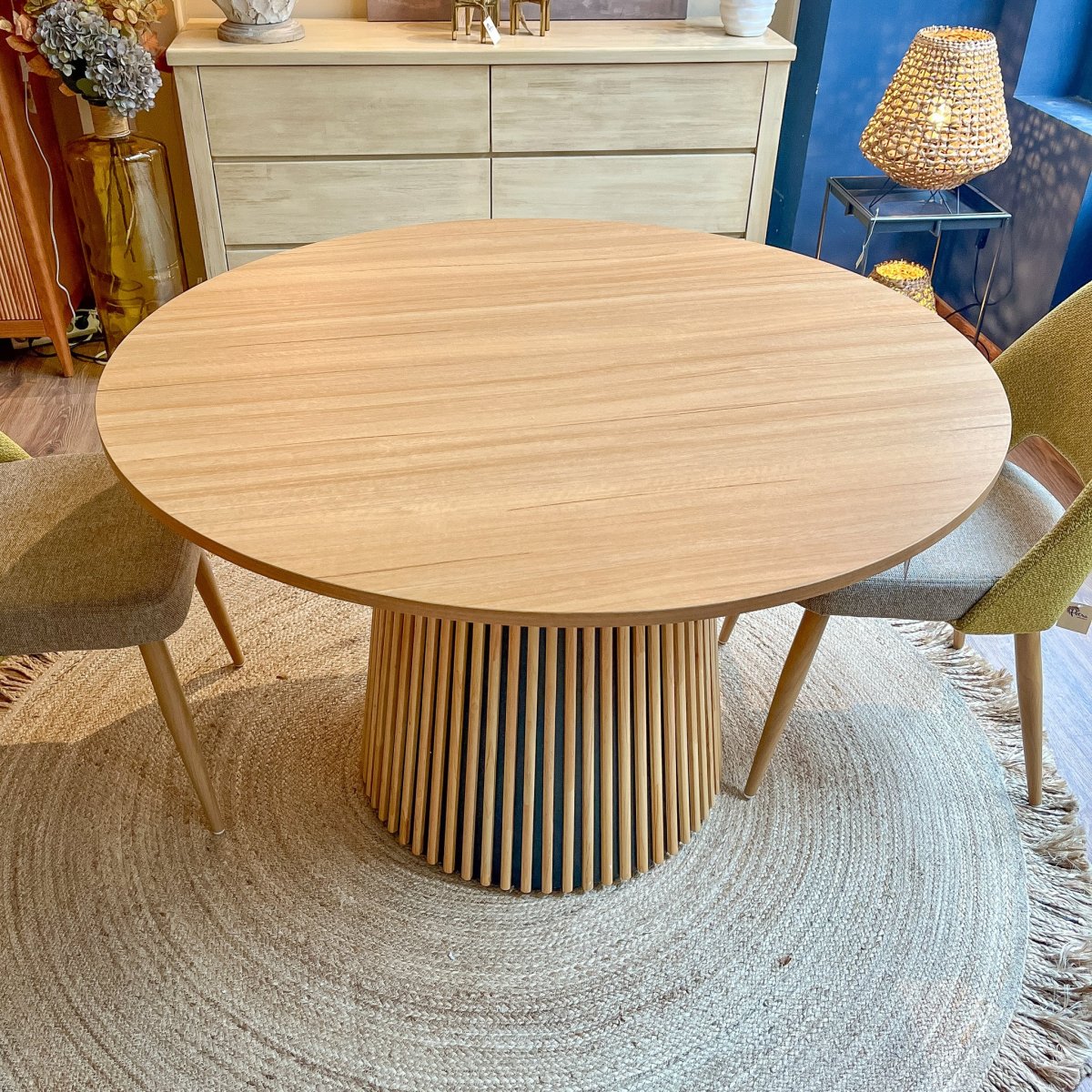 Esta mesa extensible combina diseño y funcionalidad en un formato ideal para cualquier espacio. Su tablero de melamina con acabado natural aporta calidez y resistencia, mientras que el sistema extensible, que incluye movilidad de las patas, garantiza comodidad al ampliar de 120 cm hasta 2 metros. La base entablillada es el toque distintivo que la convierte en un elemento decorativo único, con un diseño que aporta carácter y estilo a cualquier comedor. Perfecta para reuniones íntimas o grandes encuentros. El modelo Keanu es una mesa de comedor redonda de 120x120x73cm con mucha personalidad.
