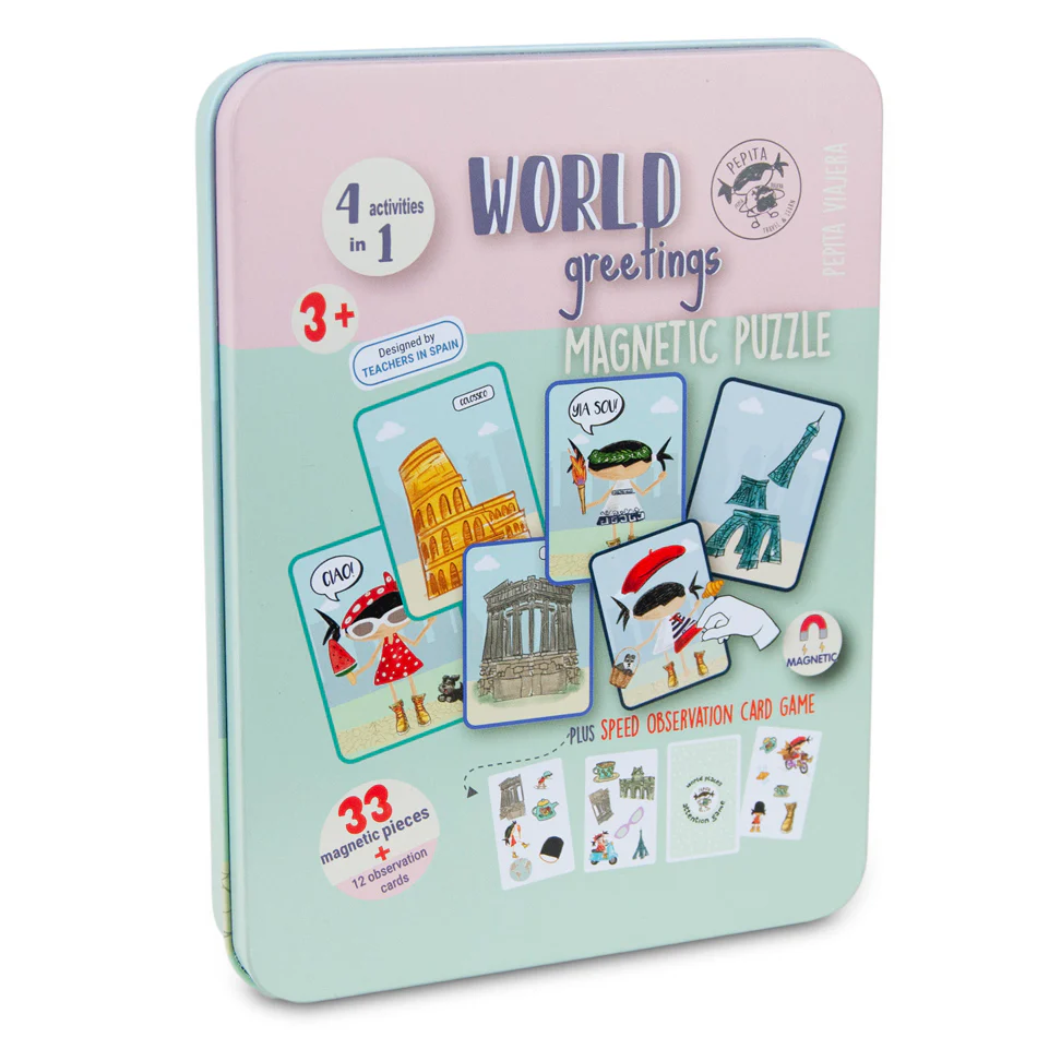 El Pack Escapada Saludos del Mundo de Pepita Viajera es ideal para peques curiosos que aman explorar y aprender jugando. Incluye una mochila-pizarra hecha con R-PET reciclado, con neceser interior extraíble y solapa para dibujar, una botella térmica de acero inoxidable 316 (400 ml) que mantiene las bebidas frías o calientes hasta 12 horas, un cuaderno de colorear con acuarelas y pincel incluido, y una caja de juego magnética con 33 imanes y cartas de observación. Todos los artículos tienen un enfoque educativo, funcional y sostenible, pensados para acompañar a los pequeños viajeros en cada aventura con creatividad y conciencia ambiental.